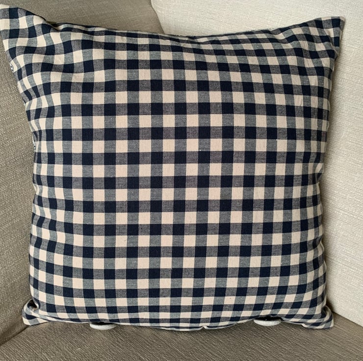 The reverse side of the cushion has been made from the beige/charcoal checked fabric. A facing using the ‘tree’ fabric has been attached at the bottom edge and two black corded loops and two beige fabric covered buttons have been added to close.