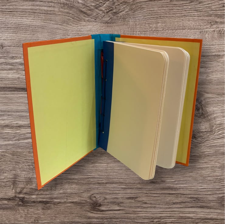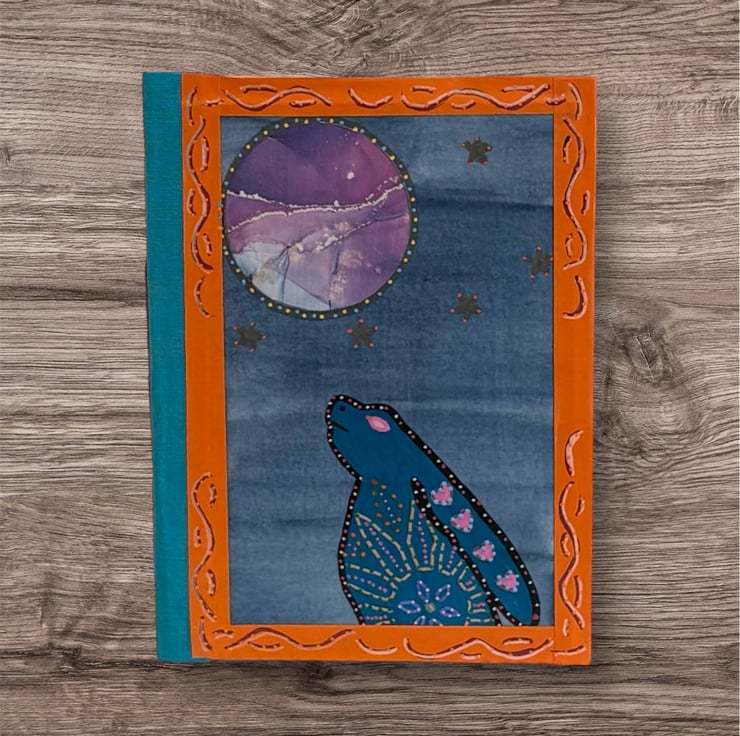 This notebook is hand constructed with a hand painted and collage cover design. It contains twelve A6 signatures of premium writing paper which are hand stitched to the spine.