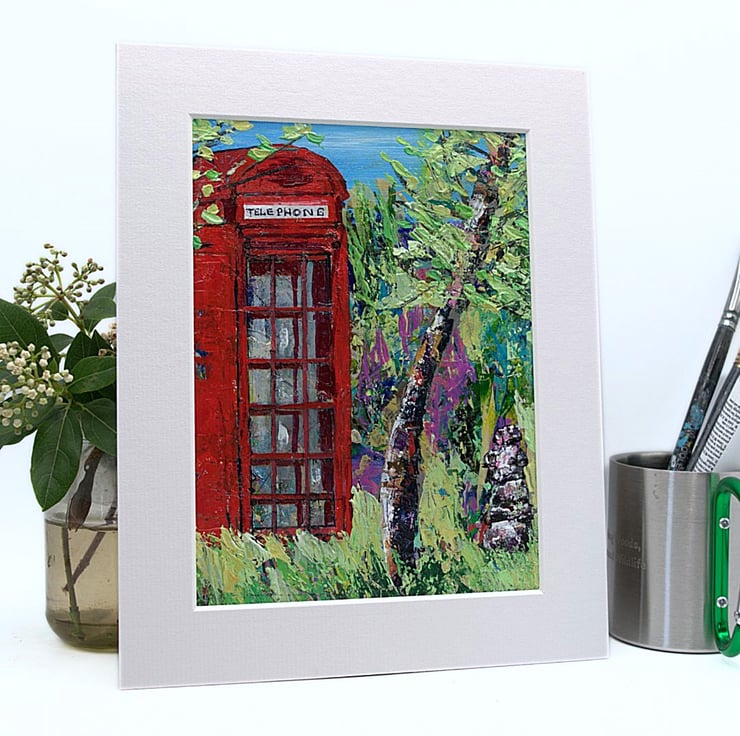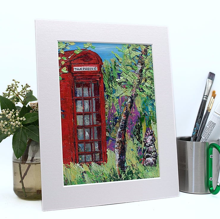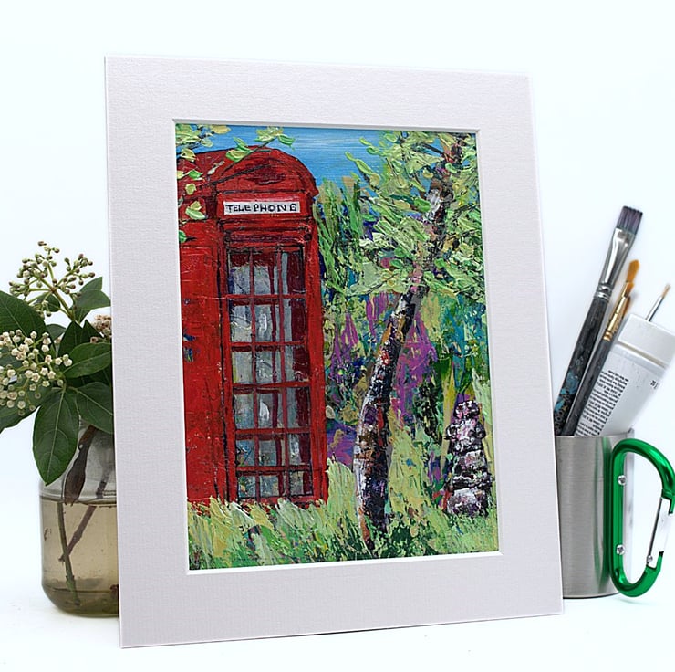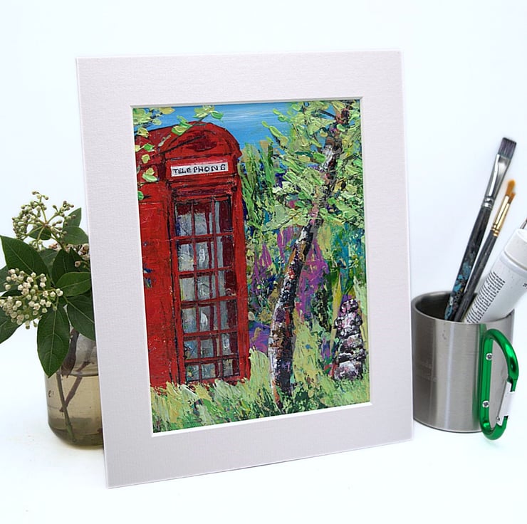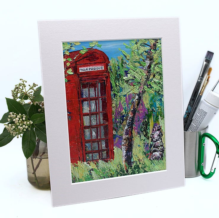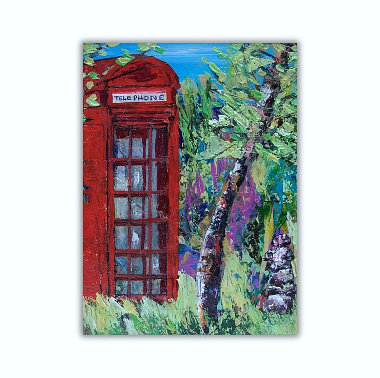 This is an original acrylic landscape painting. It features a solitary weather-worn, red phone box. The sky in the distance is a clear, bright blue. Surrounding the phone box is a mass of grasses and trees, suggesting remoteness. This acrylic painting has been created using professional quality acrylic paints and a mix of brushes, sponges and painting knives.
