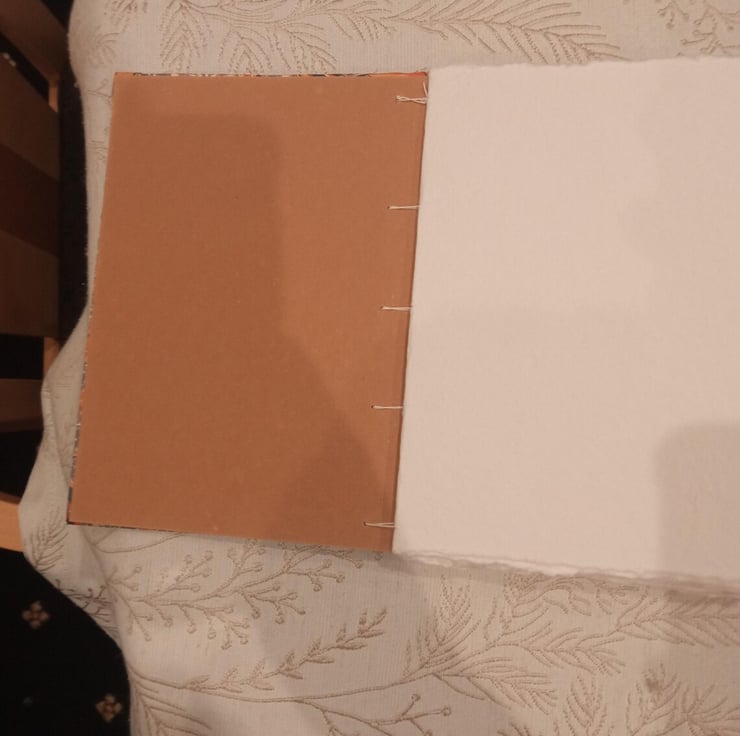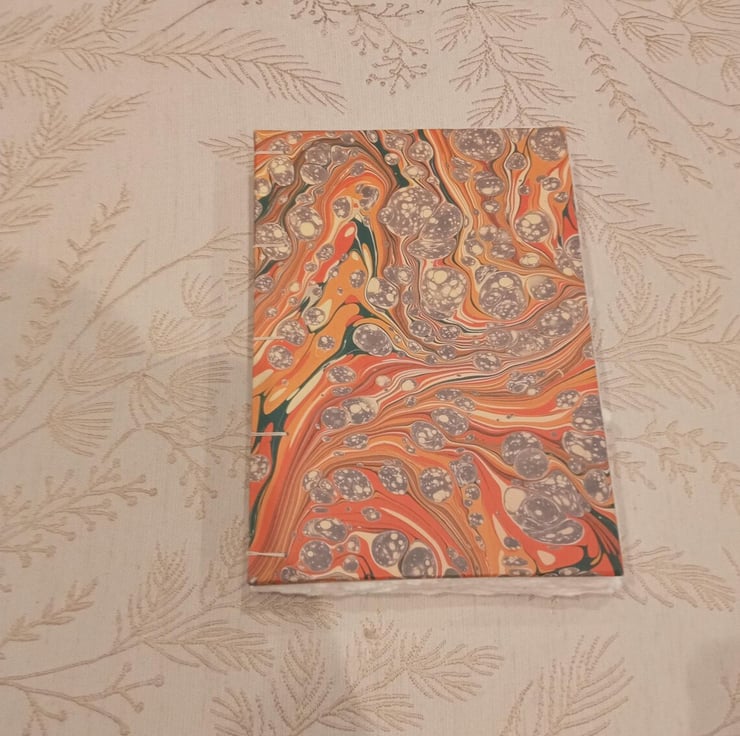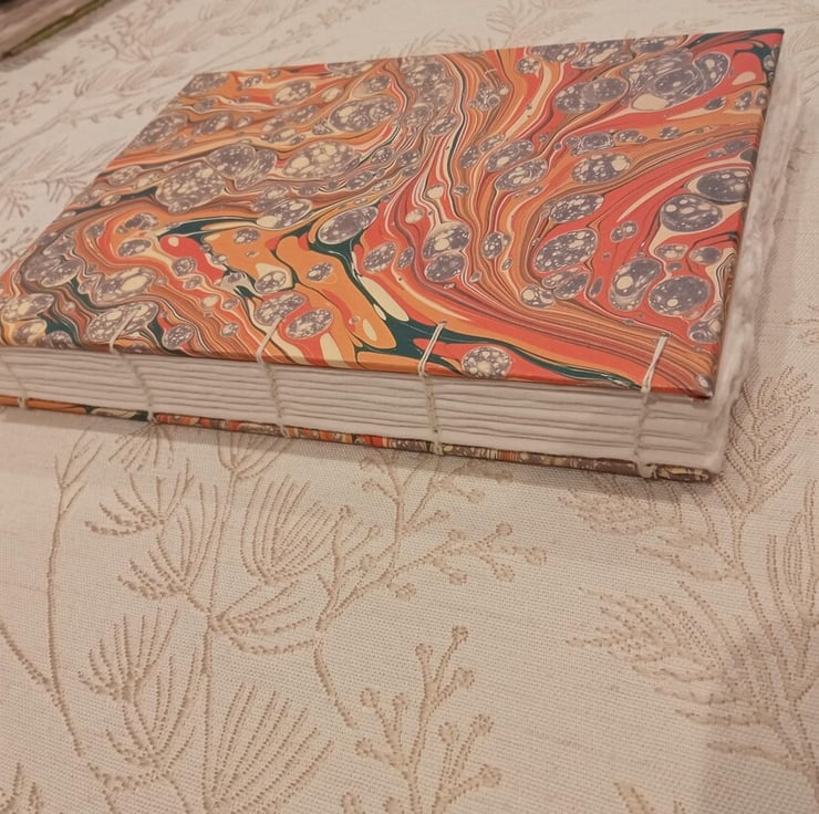Watercolour sketchbook made with hand-torn indian cotton rag watercolour paper, bound with an open spine coptic stitch using linen thread, greyboard and printed marbled paper to make this sketchbook.