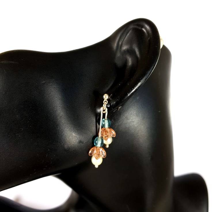 Pretty Flower Bead Dangle Earrings Sterling Silver Cultured Pearl Upcycled Beads