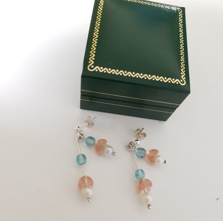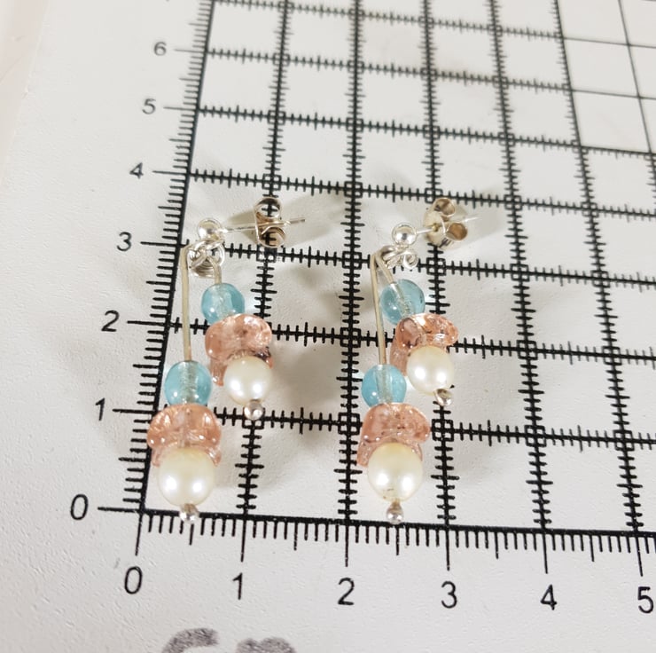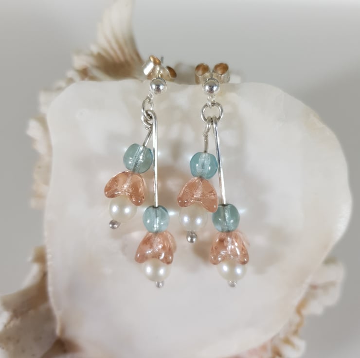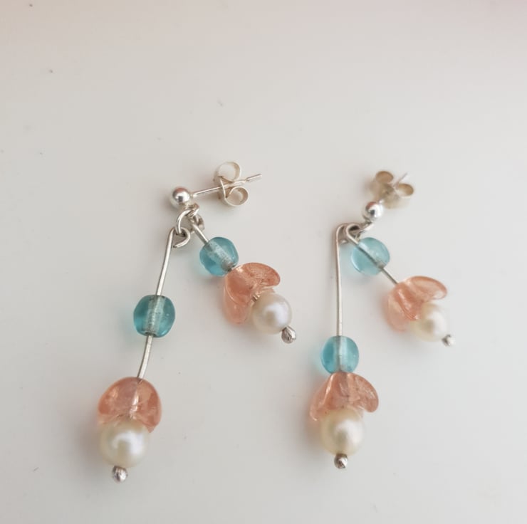 These earrings are made from Sterling silver, cultured pearls and upcycled glass beads from a vintage necklace. The pink beads are especially pretty and have a flower petal shape.