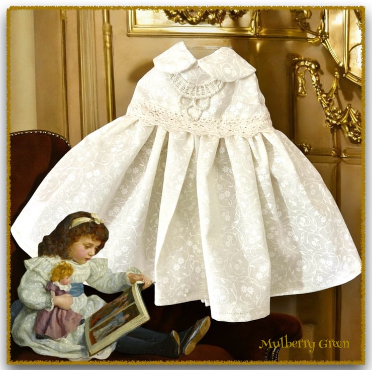 A beautiful little ivory dress with a lace trimmed bodice, to fit the Mulberry Green characters. The dress is part of the heirloom collection.
