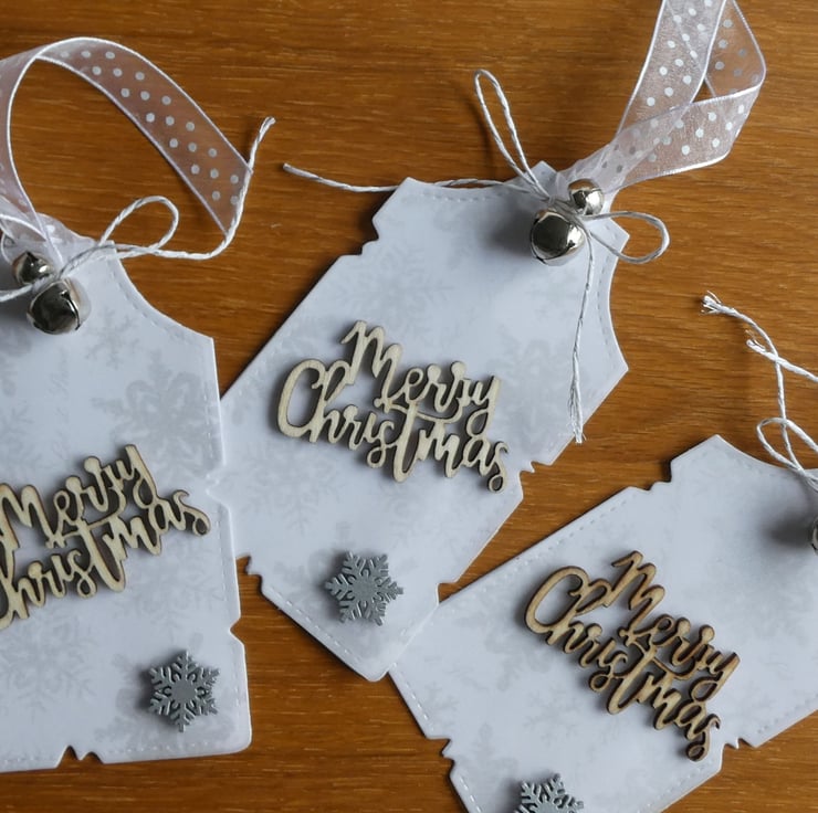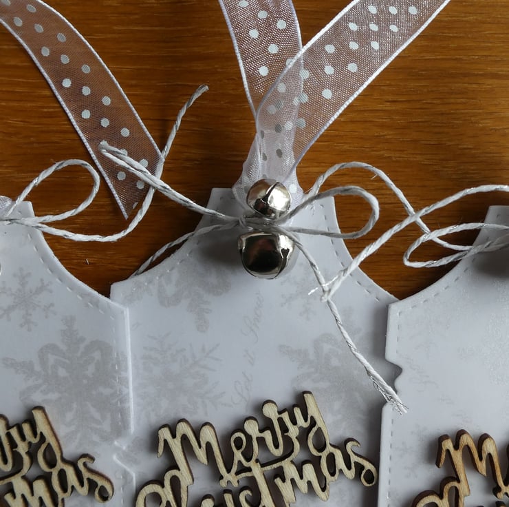 The tags have been finished with two silver metallic bells, tied with white and silver twine and a white polka dot ribbon to use to attach to your gift. The back is blank for your message.