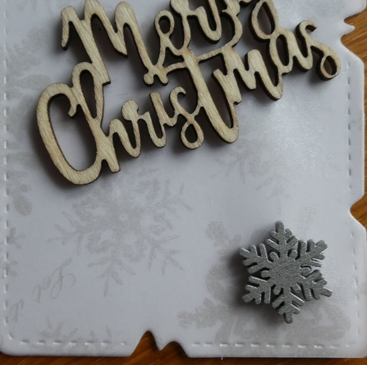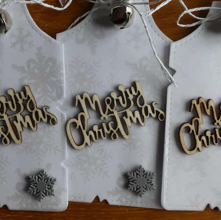 Each white card tag has been die cut with a notched edge and topped with a patterned faux vellum layer, printed with silver snowflakes and the words 'let it snow'. A natural wood Merry Christmas message and a slver wooden snowflake have then been added.
