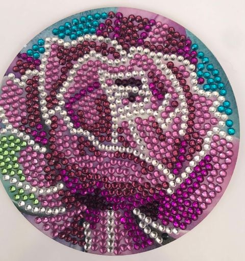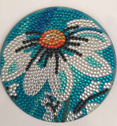 Sparkling beads have been placed one by one, by hand, to create these lovely coasters -flower designs. Each coaster was sealed after the beads were placed. Worked on these up to six hours.Heat Resistant Drink, Wood and Acrylic.