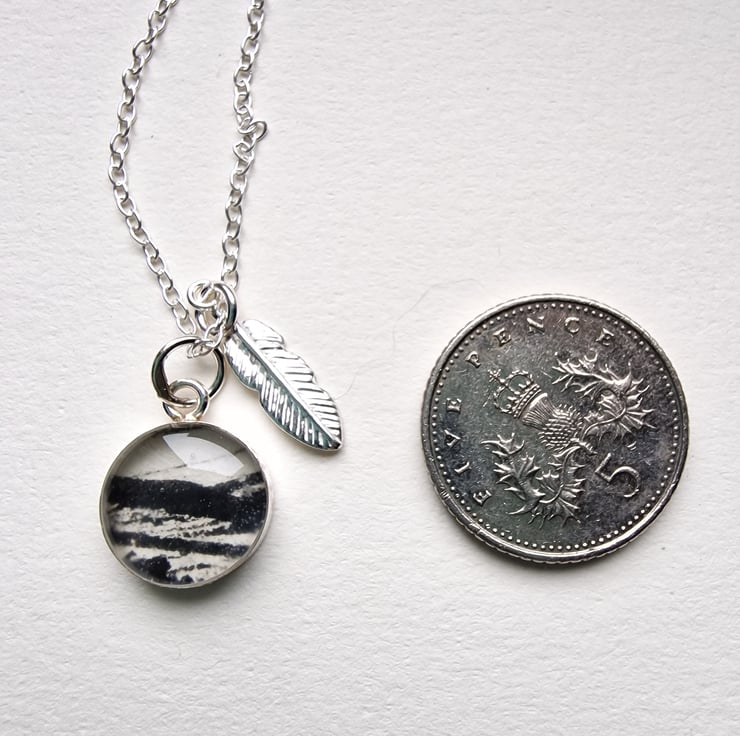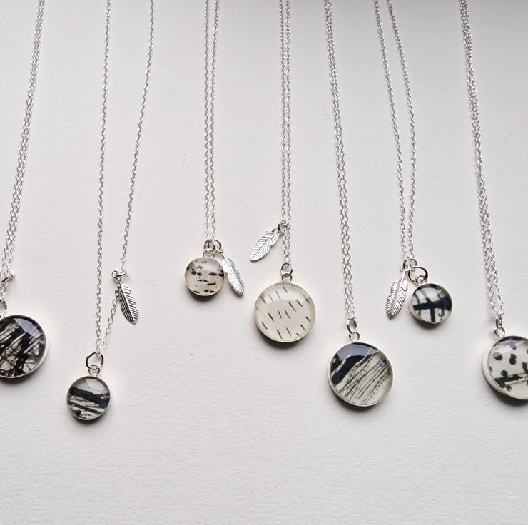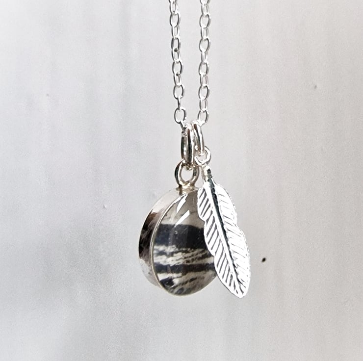 A unique sterling silver and resin pendant necklace enclosing a tiny original art fragment. The necklace is completed with a dainty sterling silver feather charm.