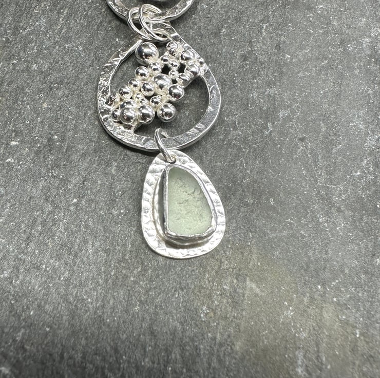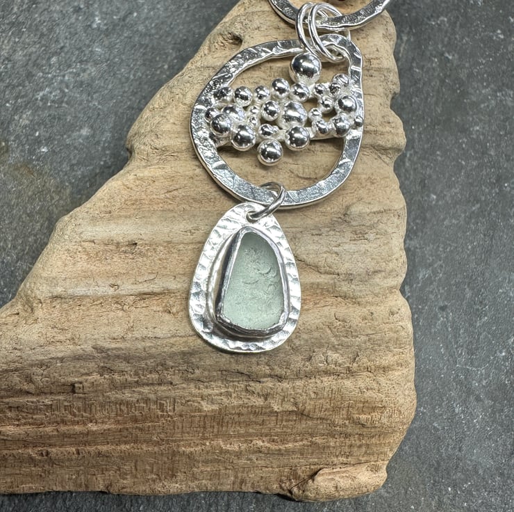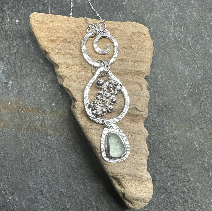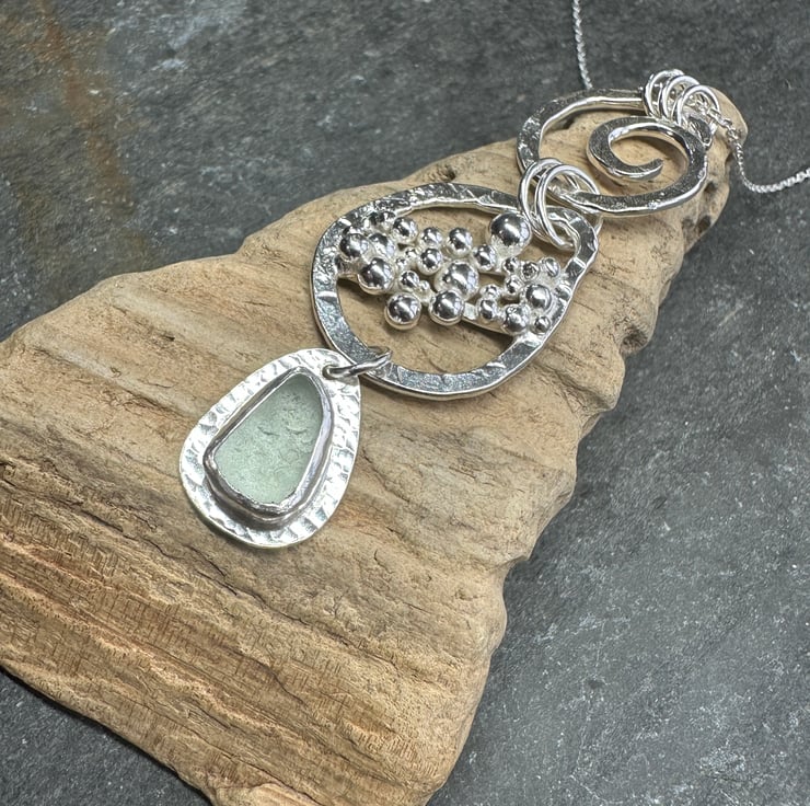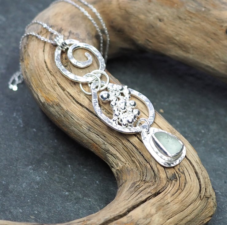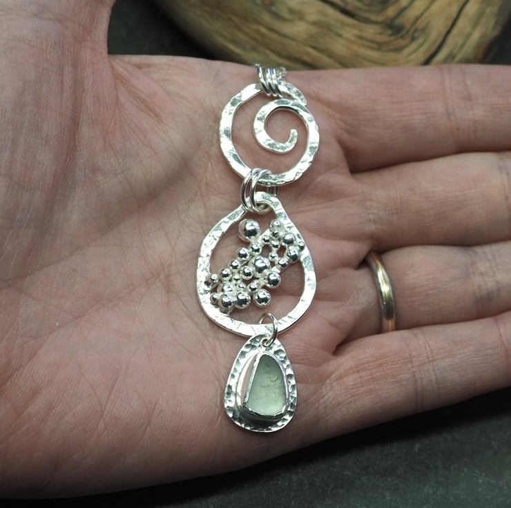 I thoroughly enjoyed making this unique piece of silver and sea glass jewellery. It features three sections - a hammered silver spiral at the top, a large droplet shape with a cluster of silver pebbles in the middle and a lovely piece of frosted pale green sea glass at the bottom.