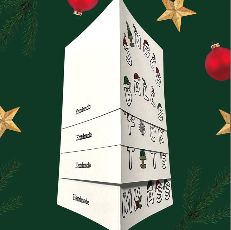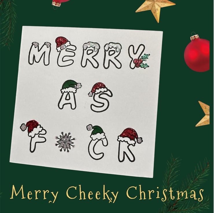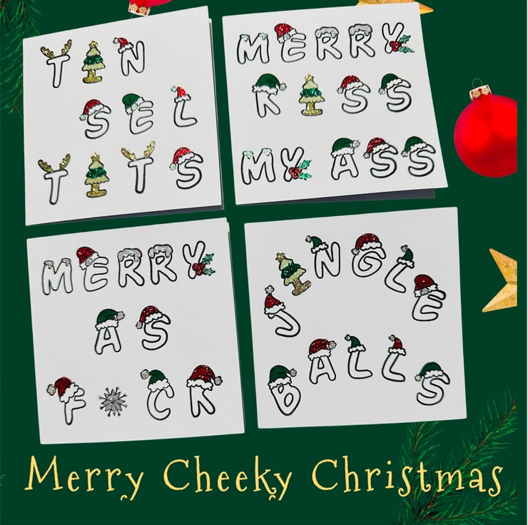 Super unique, these are cute but cheeky contemporary Christmas cards with novelty Christmas themed naughty greeting messages in a seasonal text.