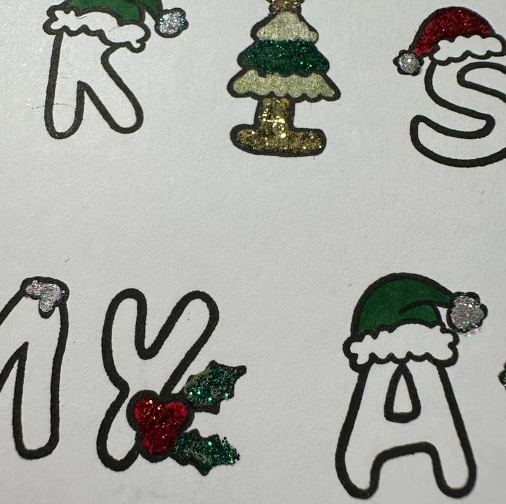 Each has a different message which has been hand stamped, hand painted with watercolours and then embellished with glitters on the hats, snow, reindeer antlers and holly to make the words POP out on the white background.
