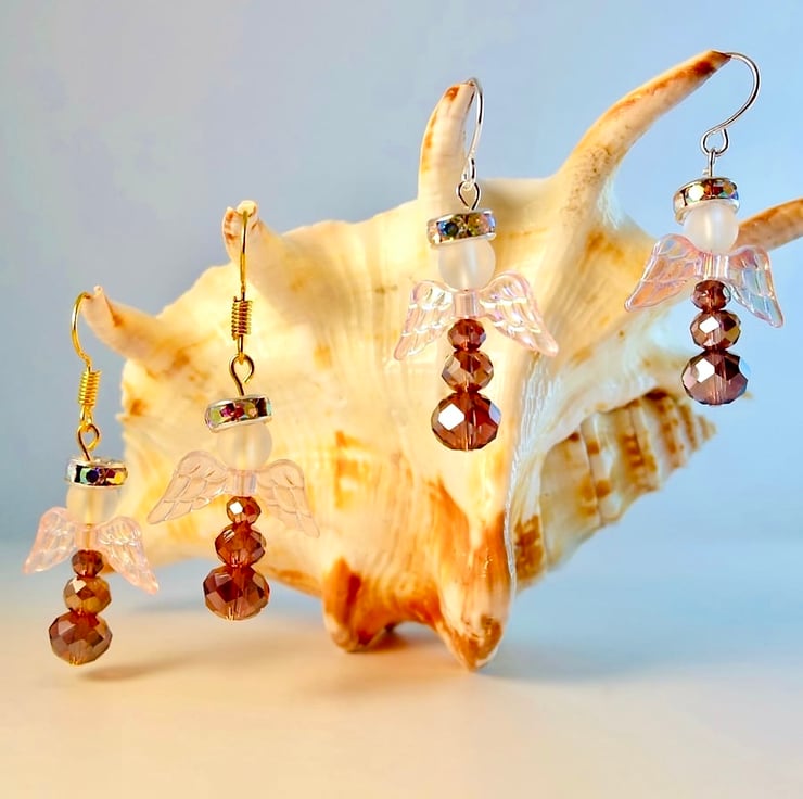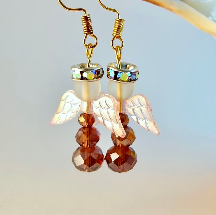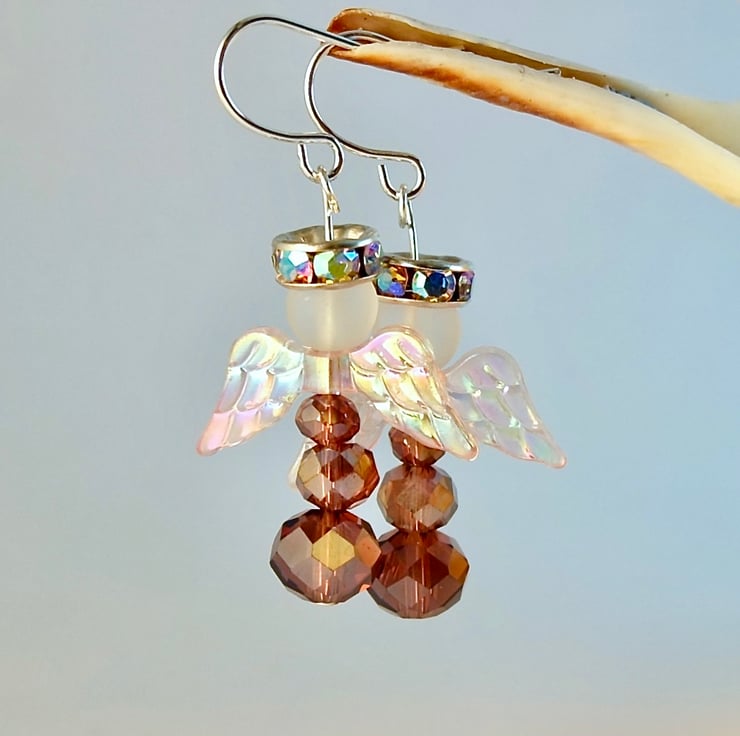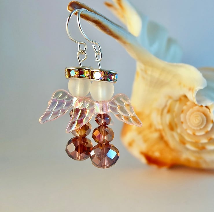 Each of these sparkly angel earrings features a trio of faceted, plum coloured, glass rondelles, a pair of translucent, shimmering pale pink, acrylic wings, a frosted glass head and a silver halo set with glittering rhinestones.