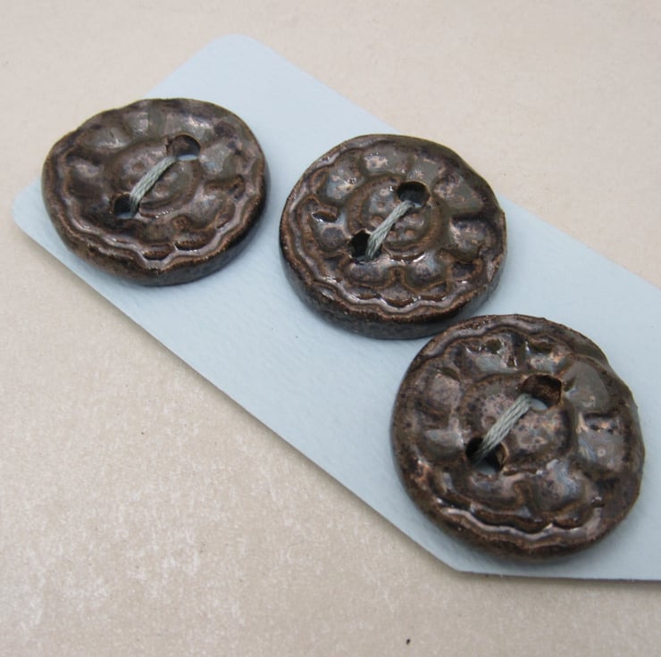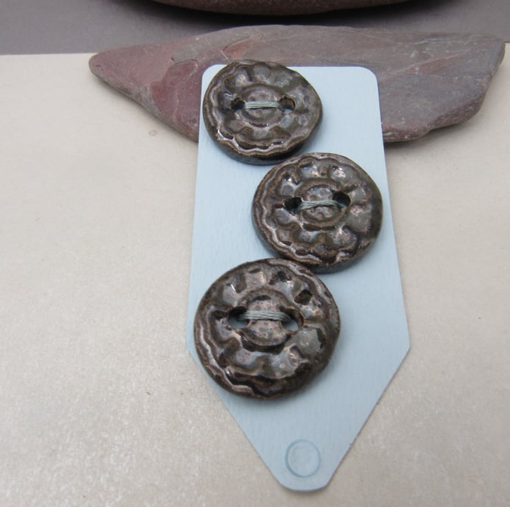 3 medium sized stoneware buttons, with an Indian cog motif printed into the upper face.