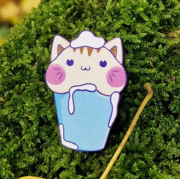 A cat pin that makes the perfect gift for cat and coffee lovers alike! It's a cat-uccino! This adorable wooden cat pin is crafted in the UK from FSC wood with a choice of metal or rubber backing, and posted with zero plastic.