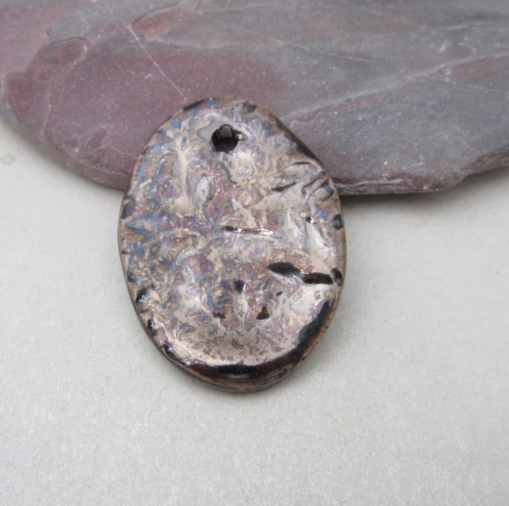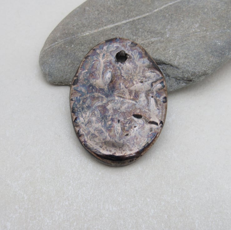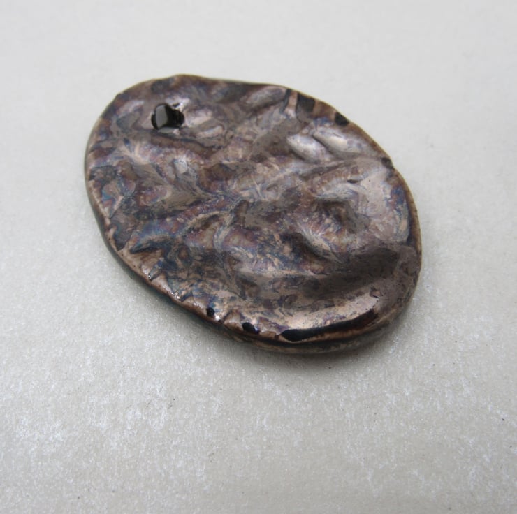 Large stoneware ceramic pendant, patterned with an embossed design of tiny leaves, and finished with a dark bronze brown glaze.