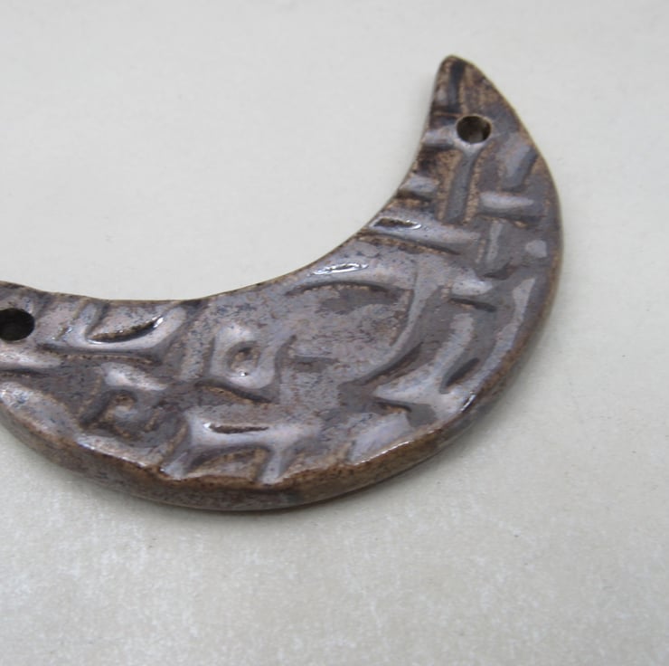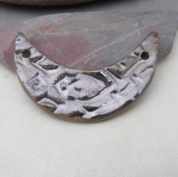 Stoneware ceramic bib pendant patterned with celtic knotwork.