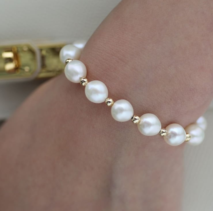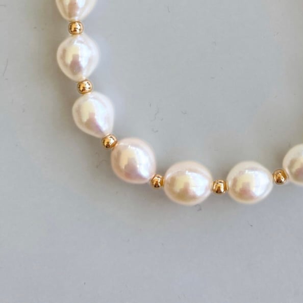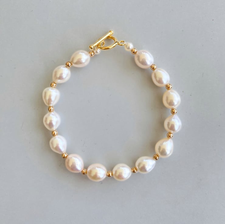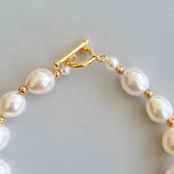 This beautiful bracelet features white teardrop freshwater pearls, elegantly strung together. It is finished with a gold-plated toggle clasp for easy wearing. The classic design makes it a lovely accessory for any occasion, adding a touch of elegance and charm to your outfit. Perfect for gifts or personal use.