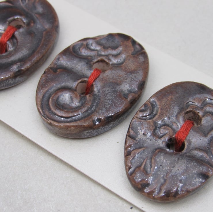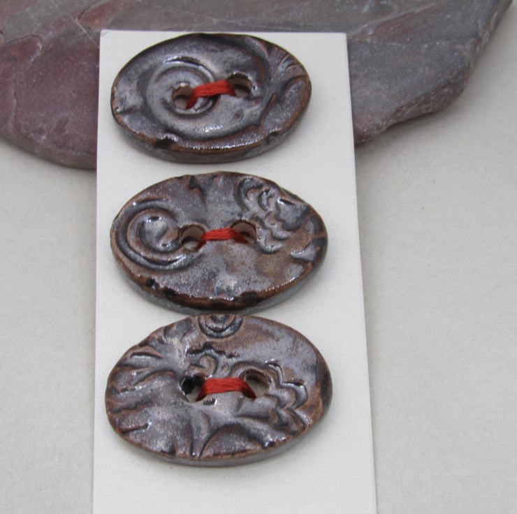 3 medium sized stoneware buttons, with a pretty brocade motif printed into the upper face. Finished with a dark brown bronze glaze.