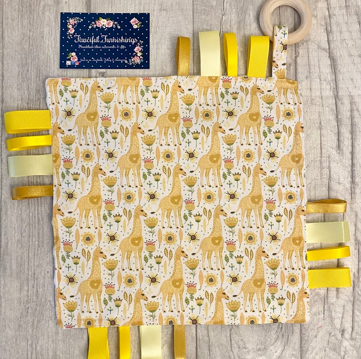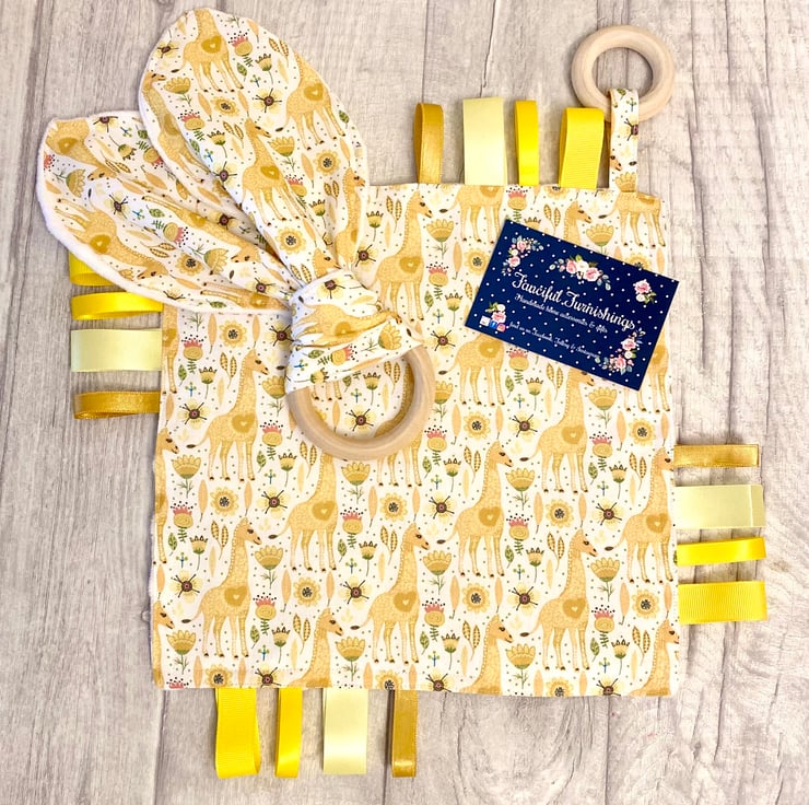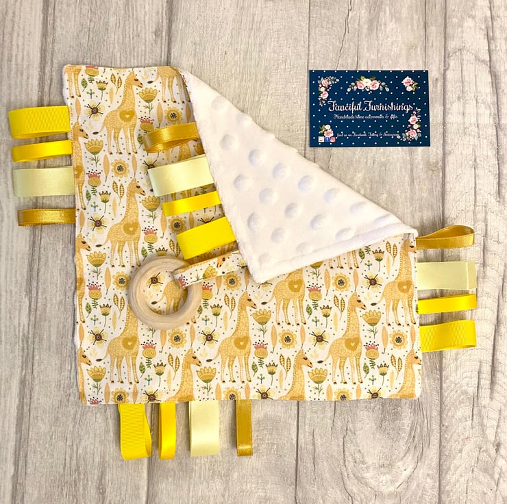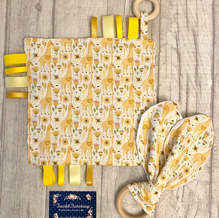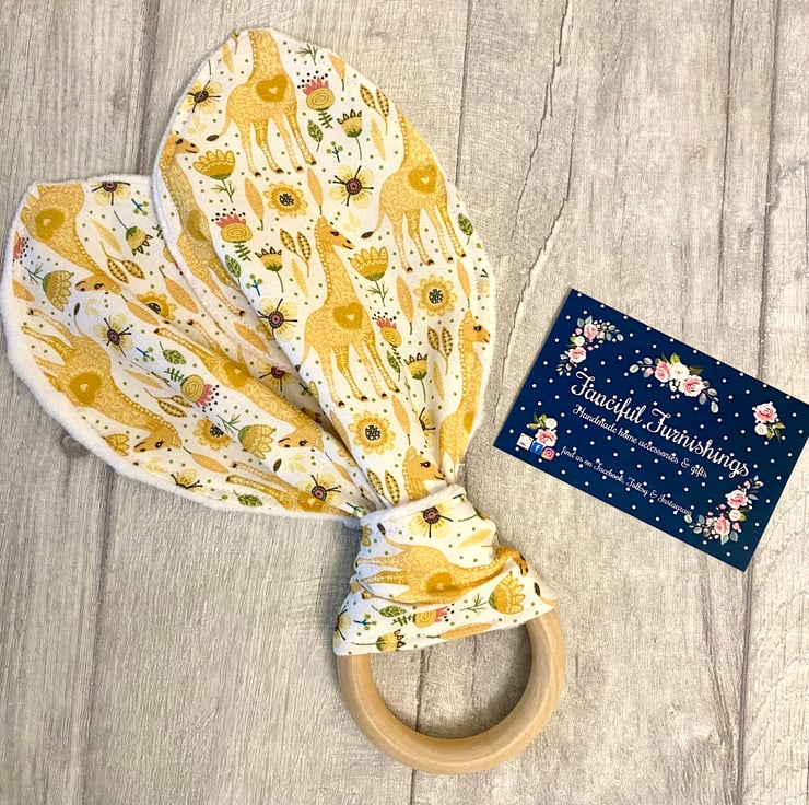 Front fabric is 100% cotton in a pretty yellow giraffe print and both items are backed with a beautiful soft white Minky fleece. I’ve used a natural wood teething ring on both items.