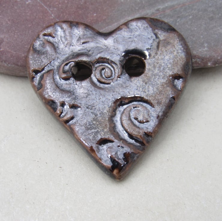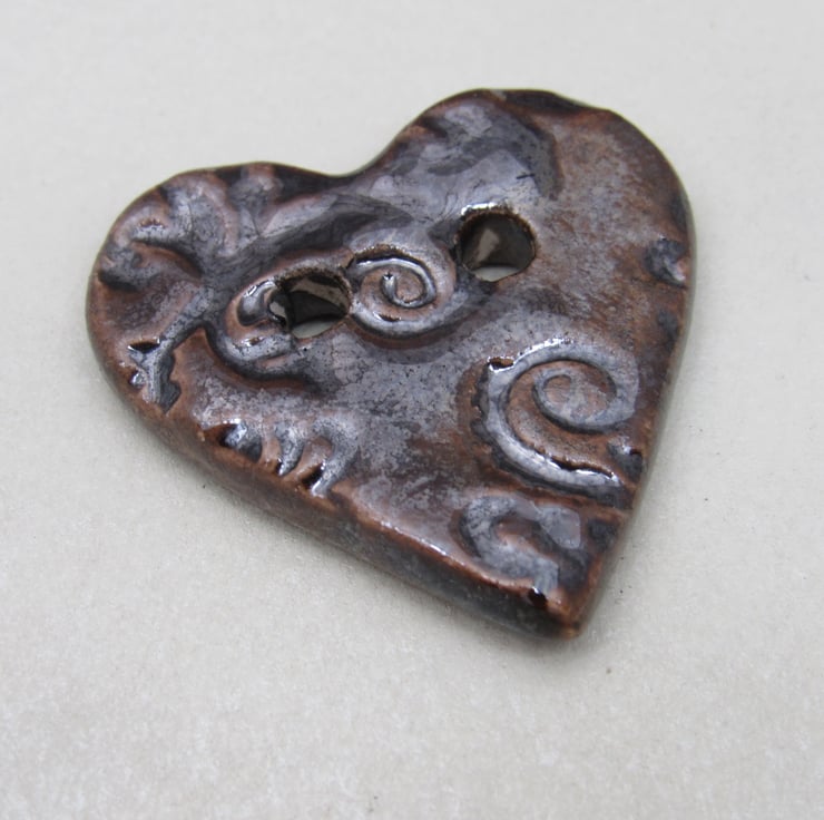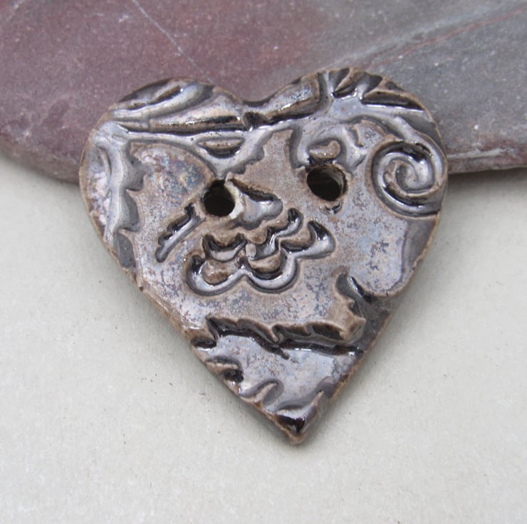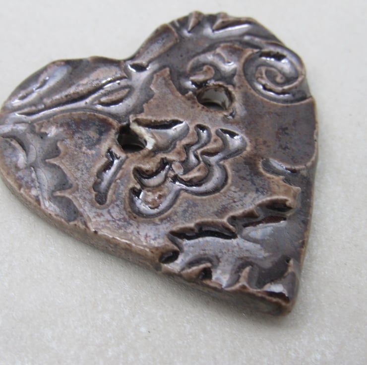 Medium heart shaped stoneware button, textured with a bold leaf and flower motif.