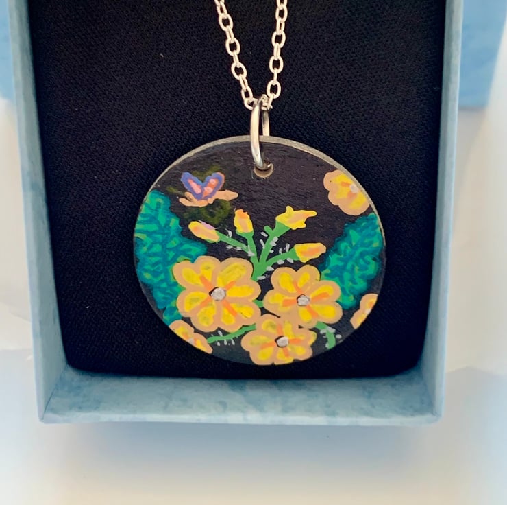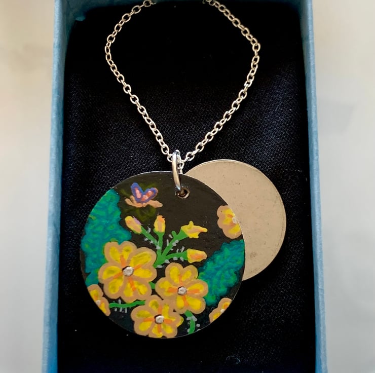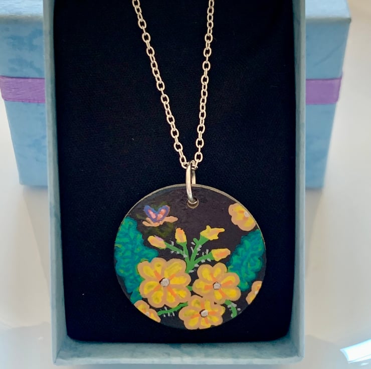 Wooden keepsake pendant painted black with a floral design. Yellow flowers and buds with a hint of orange and white centres with two tone green leaves. A small colourful butterfly as an added touch. Sealed to protect the design. I have added a blank silver coloured metal engraving disc that can be taken and engraved with a special date or other occasion to mark a special moment. Comes hung on a 18" silver plated chain.