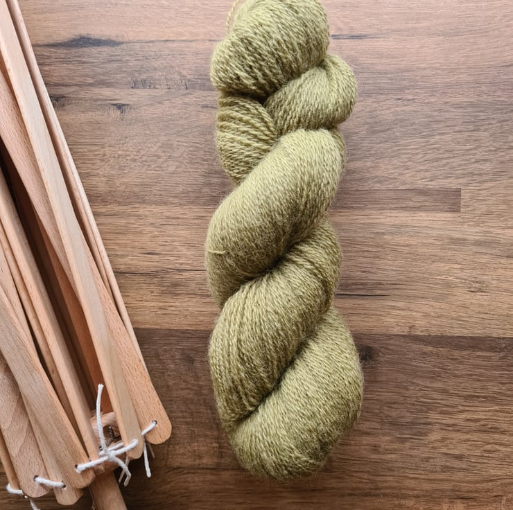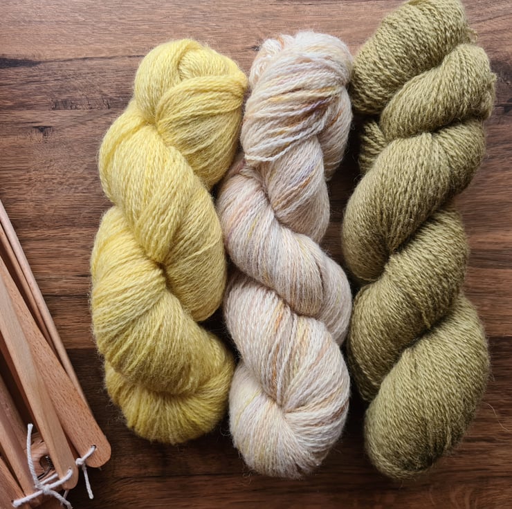 Nettles and a copper modifier was used to create gorgeous tones of naturally dyed locally spun wool yarn. Perfect for stripes and colour work in knitting, crochet, embroidery and weaving projects!