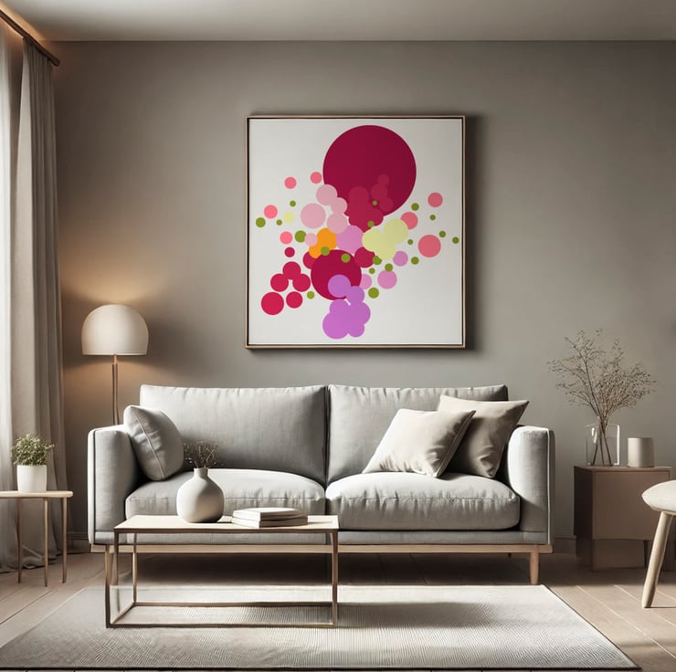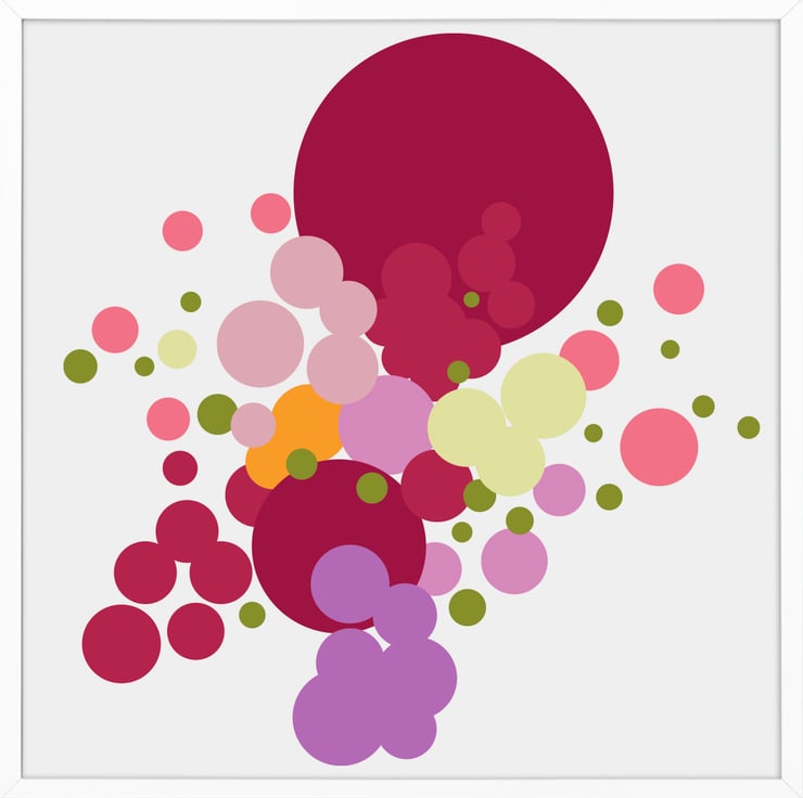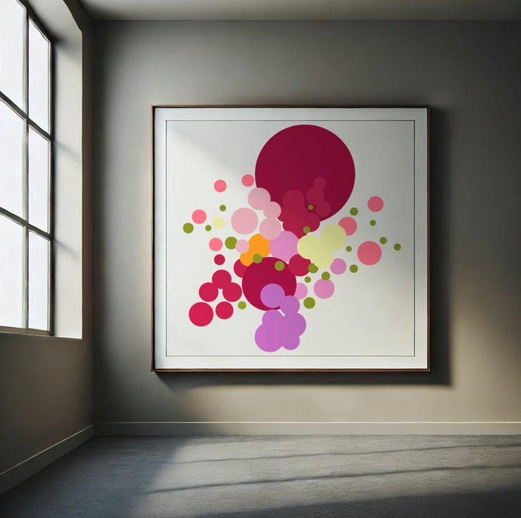 This lively composition combines nature and geometry, showcasing an abstract bouquet of overlapping circles in a rich spectrum of colours. Each vibrant shape feels like a petal in bloom, celebrating the harmony of natural forms and minimalist design. Bold reds, soothing greens, and bright yellows combine in a playful yet balanced dance of colour and shape, creating an energising and calming piece. Perfect for modern spaces, this artwork adds a touch of warmth, joy, and elegance to any room. Whether displayed this piece invites viewers to find beauty in simplicity and structure.