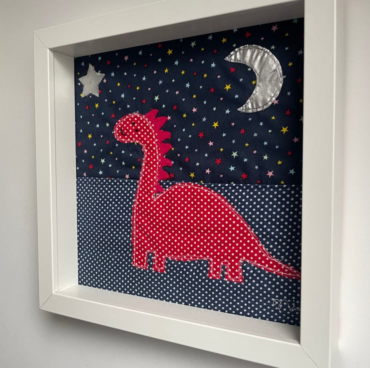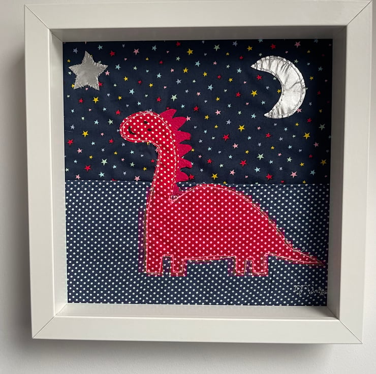 Textile picture, happy dinosaur at night with silver star and silver moon. Made by myself , sewing machine and hand stitches. Looks lovely in a children’s bedroom.