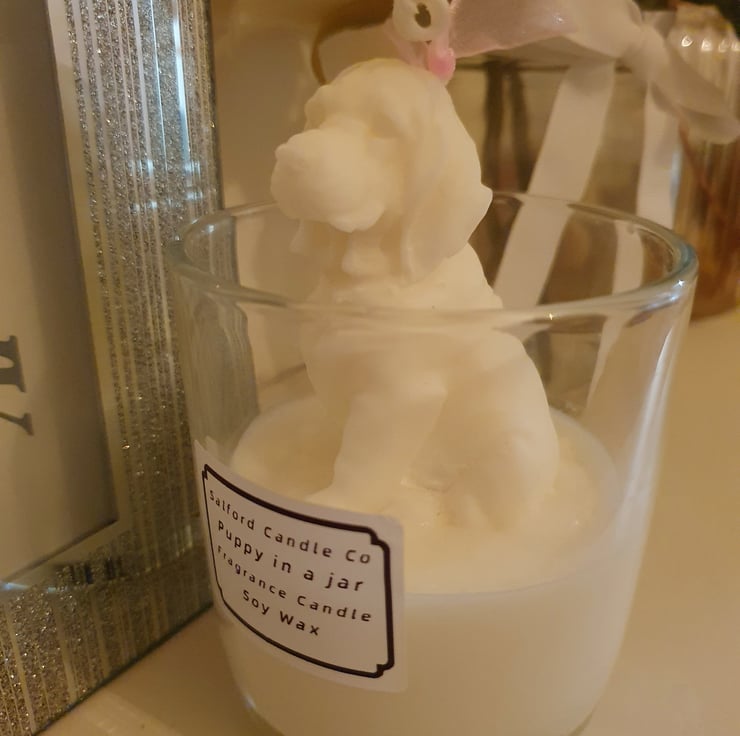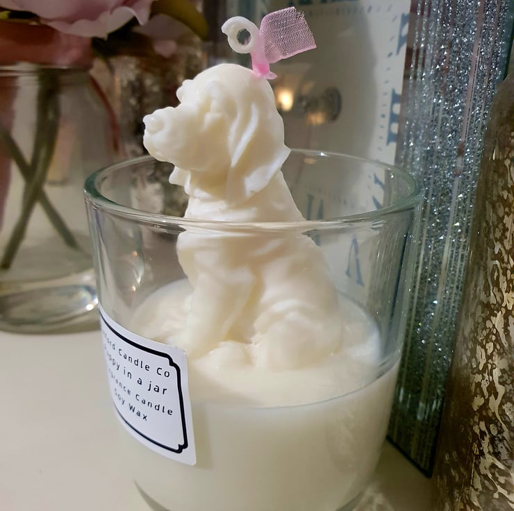 Puppy in a jar. Cute Labradore Fragranced Candle in a 30cl glass jar. Made with 100% Soy Wax. Handmade Hand poured. For all doggy friends everywhere. Perfect for your own home or as a beautiful unique gift.