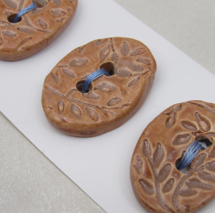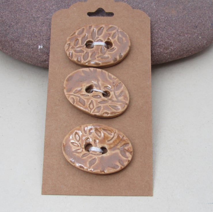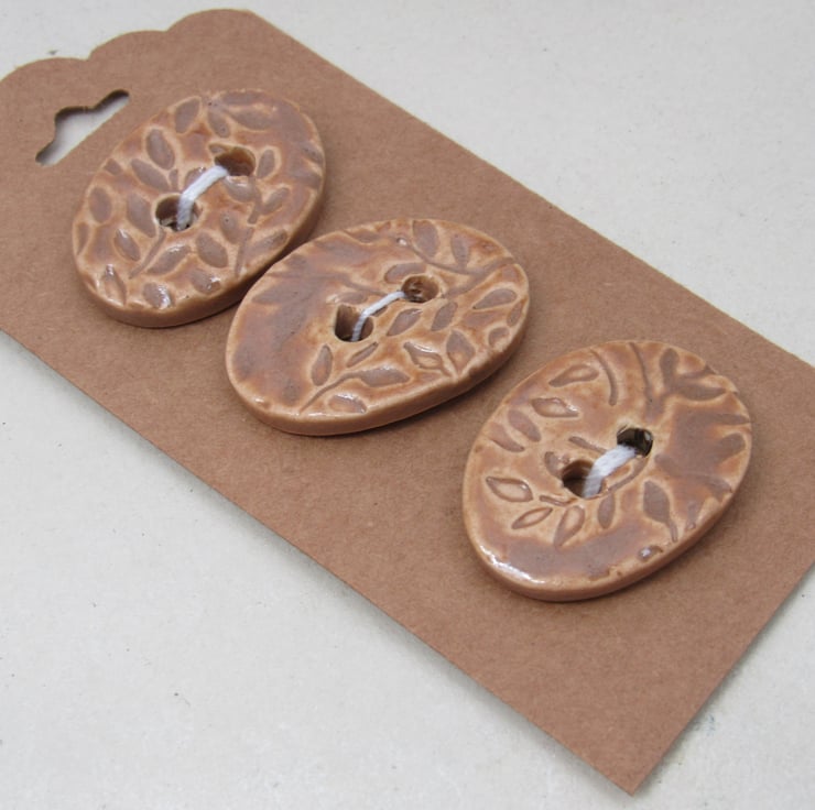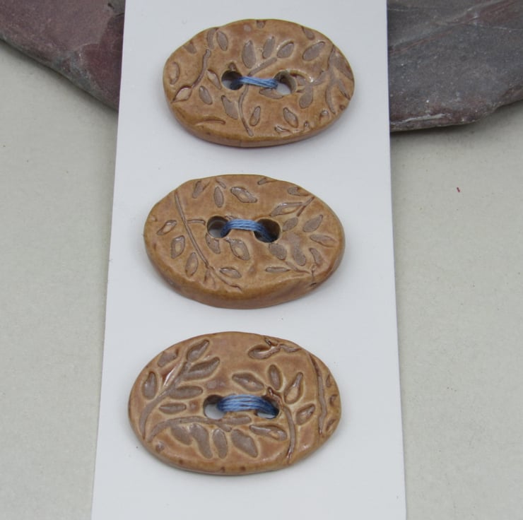 3 medium sized stoneware buttons, with a pretty leaf motif printed into the upper face. Finished with a light sandy brown glaze.