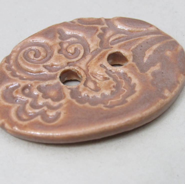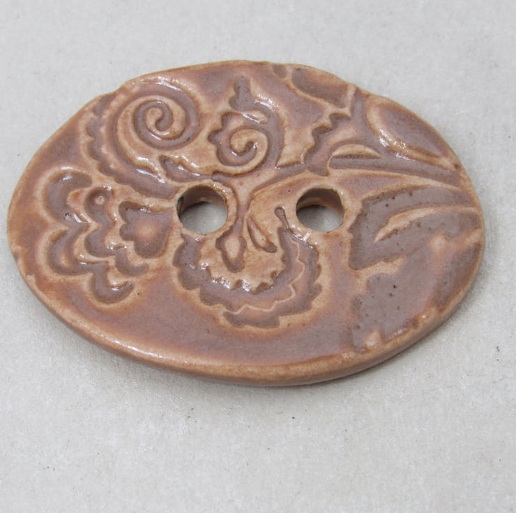 Medium oval shaped stoneware button, textured with a pretty brocade motif.