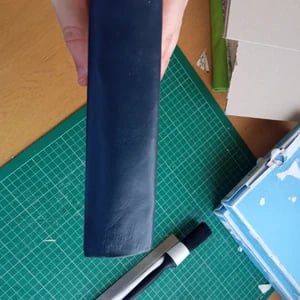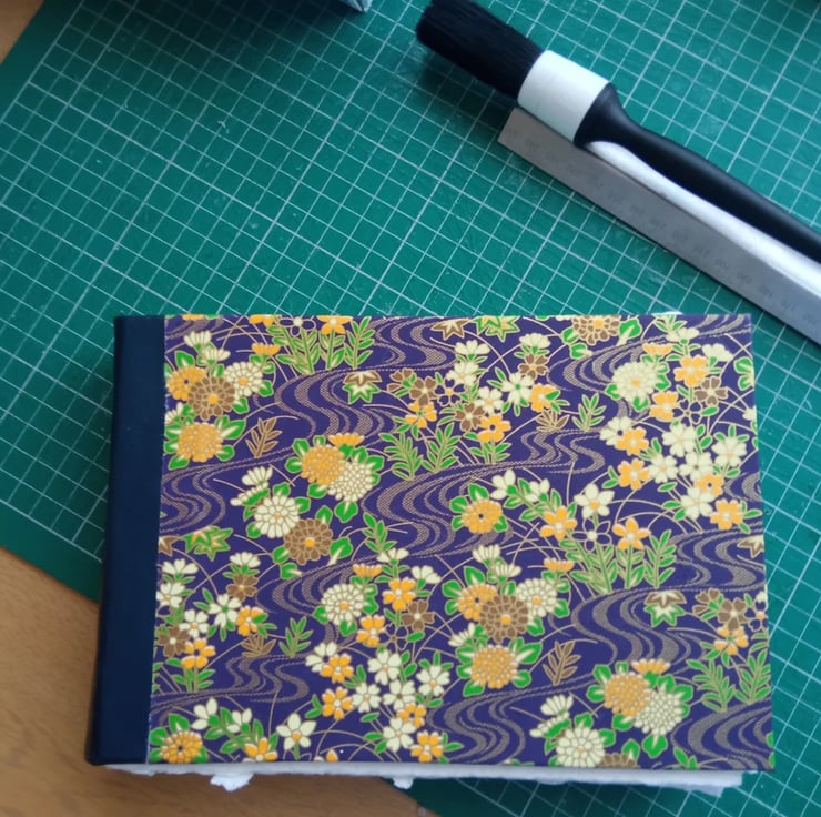 The book spine lightly glued, and the cover is Japanese paper covered greyboard with a blue skiver leather spine, bookblock glued directly to cover so no endpapers.