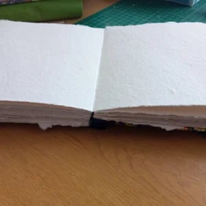 Handbound from scratch, containing hand-torm cotton rag paper (approx 250 gsm, mid rough surface) sewn on tape with linen thread.