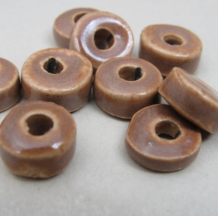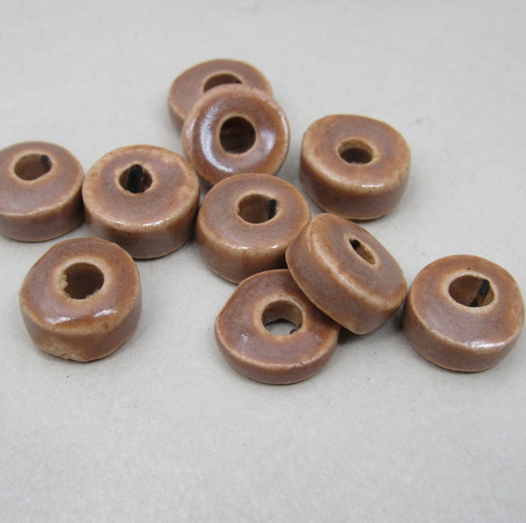 10 Small Sand Brown Glazed Ceramic Washer Beads