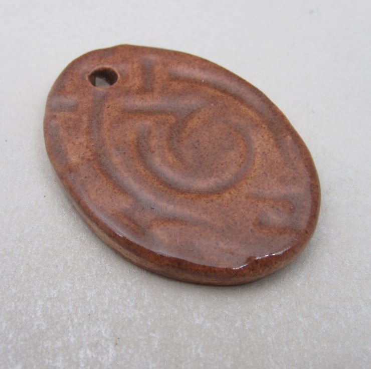 Large stoneware ceramic pendant, patterned with an embossed design of celtic knotwork, and finished with a sand brown glaze.