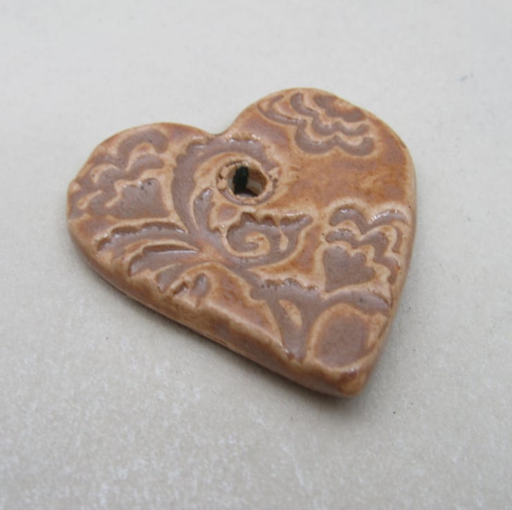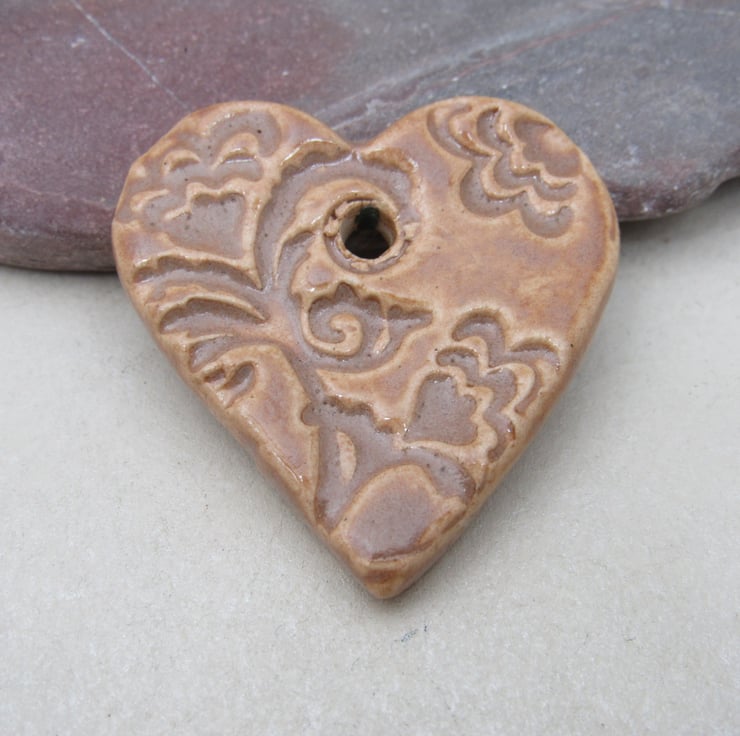 Medium Sand Brown Brocade Texture Heart Shaped Ceramic Pendant