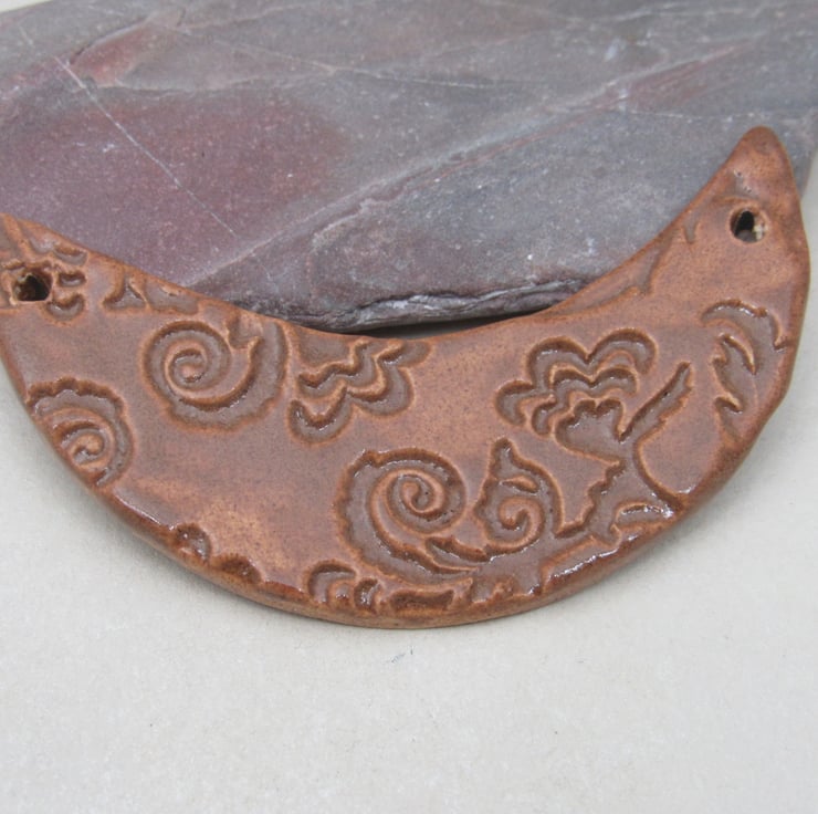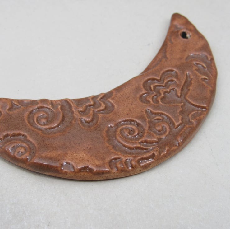 Light sandy brown glazed ceramic bib pendant patterned with textured leaves and flowers
