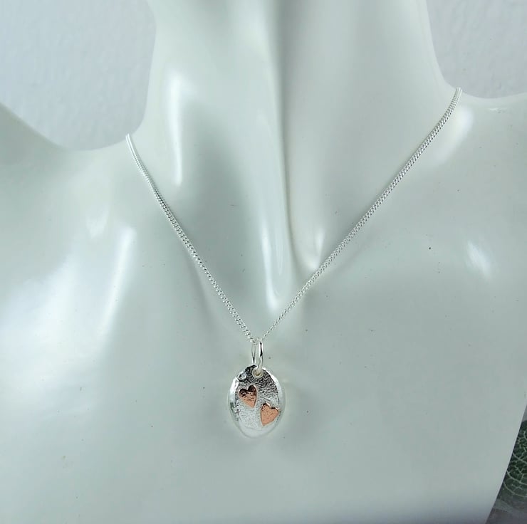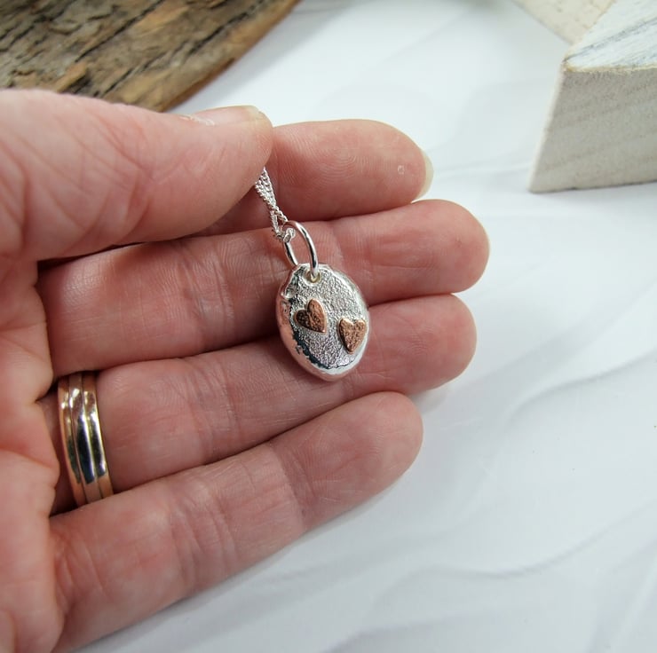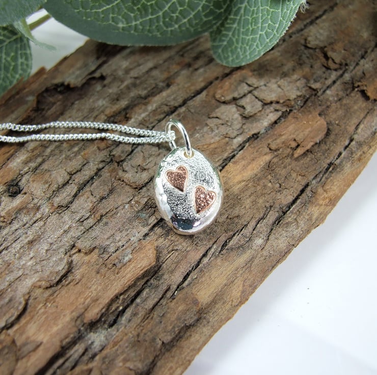 I have created the silver nugget from recycled silver heated to melting point when it forms a natural pebble shape, then once cooled I added the loop to hang. I then soldered on two tiny copper hearts. Fitted to an 18 inch sterling silver chain.