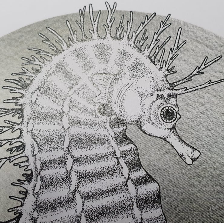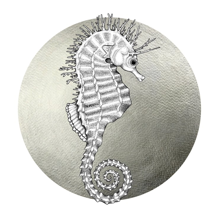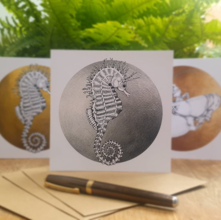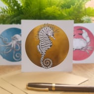 Beautiful greetings card of Steph the Spiny Seahorse in black and white on a silver circular background to give to all those lovers of the sea, coast and vibrant colours.