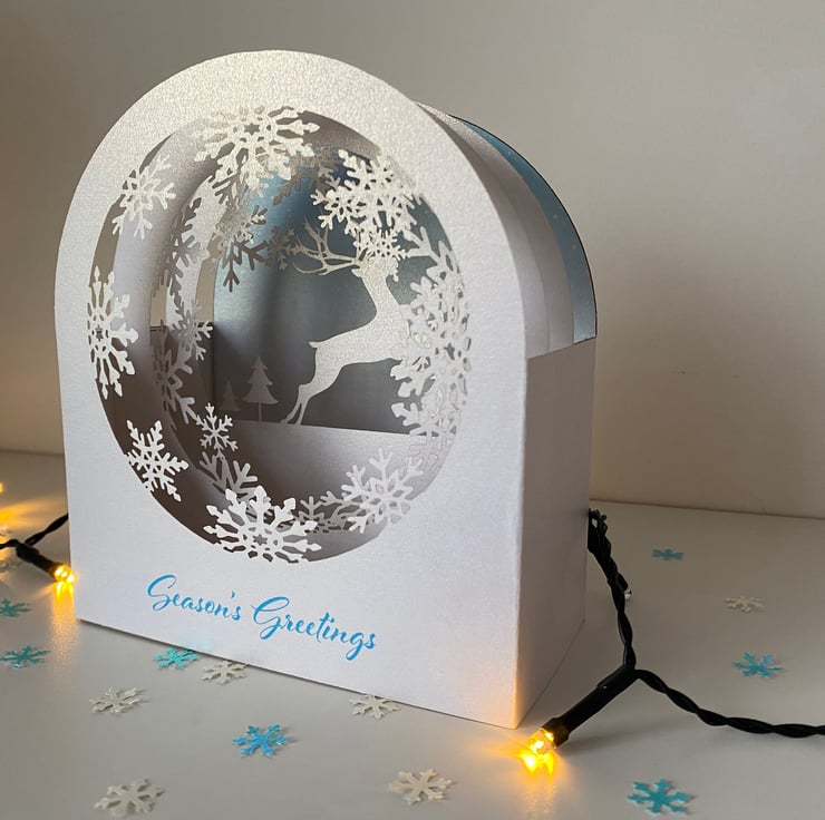 3 dimensional paper snow globe Christmas card with a wintery reindeer scene. Delicately laser-cut into white pearlescent shimmery card this card is sure to wow it's recipient. Folds flat for easy mailing. Comes with a Christmas red C5 envelope.