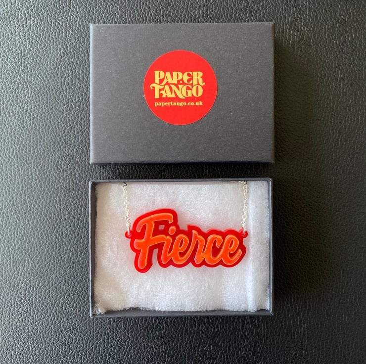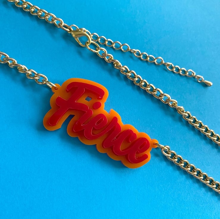 Fierce statement necklace laser-cut from red and orange 3mm acrylic with a 4.4mm gold plated trace chain, extension chain and lobster clasp. Comes packaged in an elegant black card box with a white cotton wadding interior perfect for gifting.