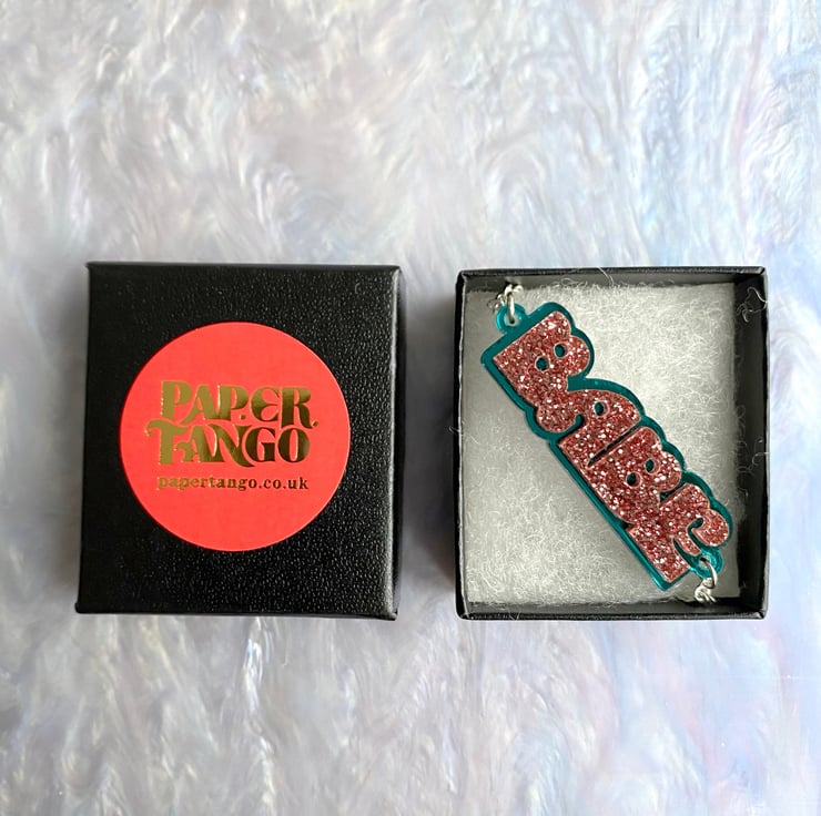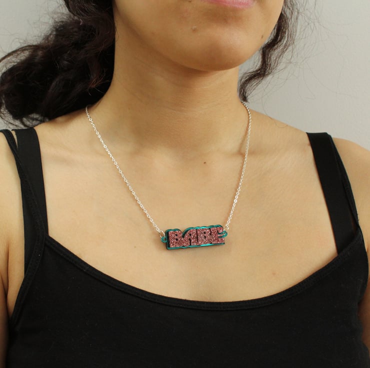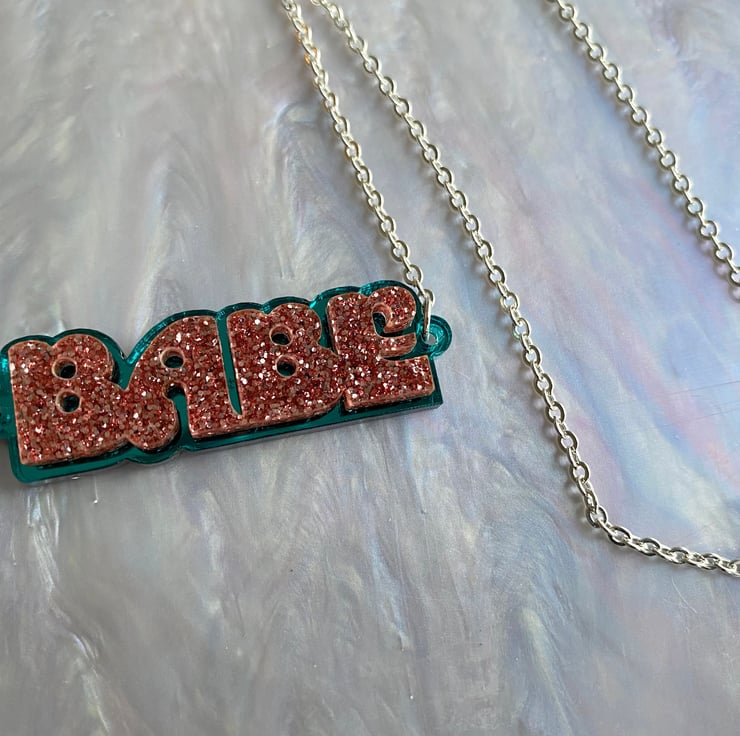 Babe necklace laser-cut from 3mm pink glitter acrylic and 3mm aqua blue mirror acrylic. 2.3mm silver plated trace chain with silver plated bolt ring closure. Packaged in a black box lined with white cotton wadding, perfect for gifting.