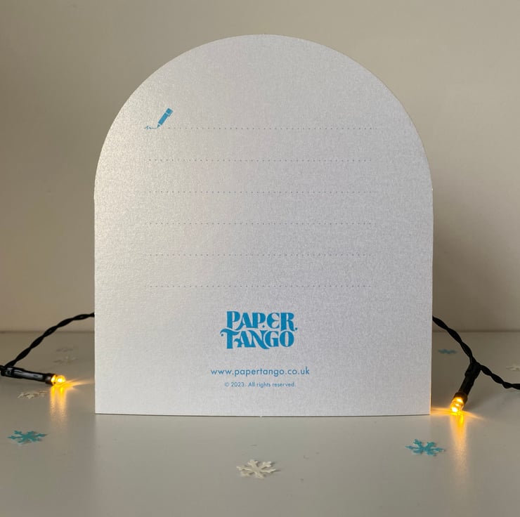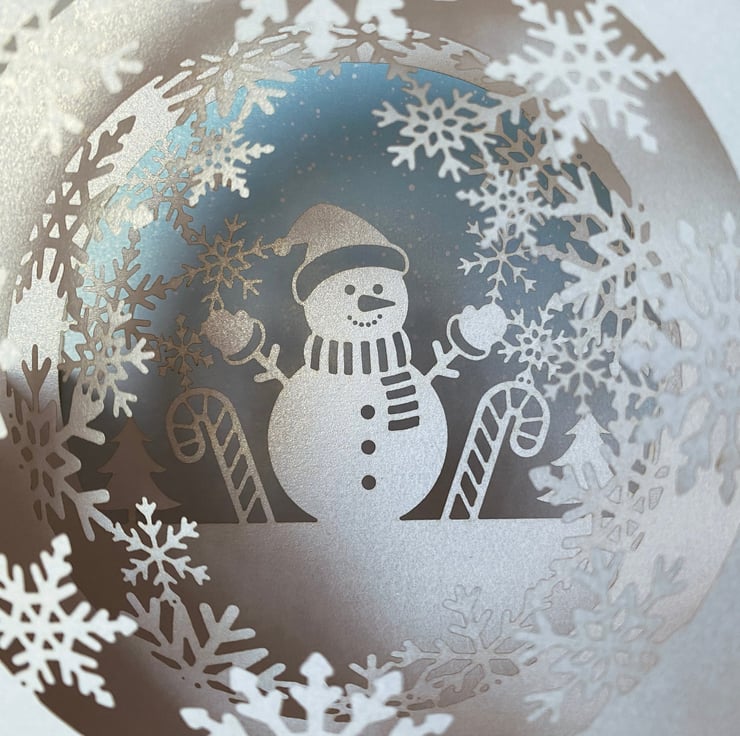 3 dimensional paper snow globe Christmas card with a cute snowman scene. Delicately laser-cut into white pearlescent shimmery card this card is sure to wow it's recipient. Folds flat for easy mailing. Comes with a Christmas red C5 envelope.