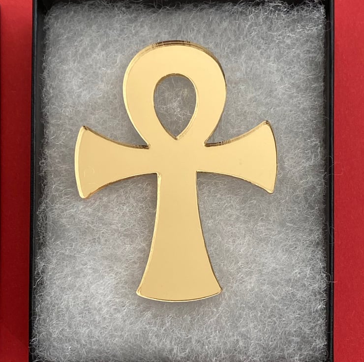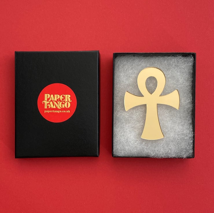 Ank symbol brooch laser-cut into gold mirror acrylic. Brooch is 49mm x 64mm. Packaged in a black gift box with white cotton wadding, perfect for gifting.