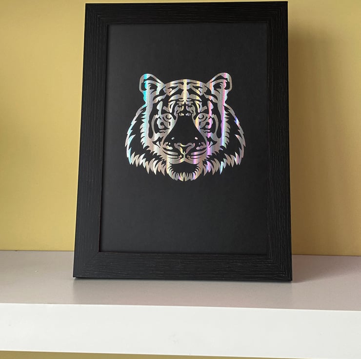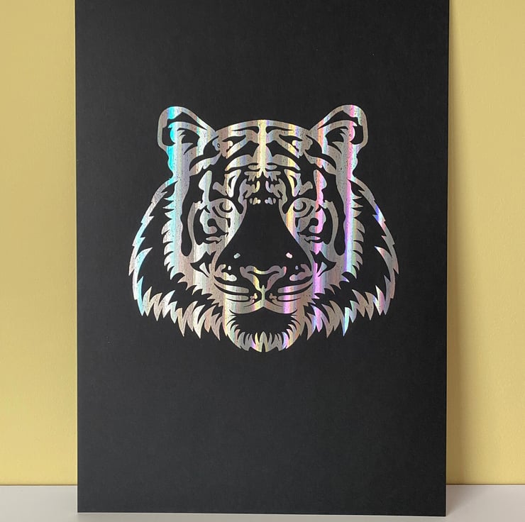 A4 tiger face poster. The tiger face is foiled in silver holographic reflective foil onto black card.
