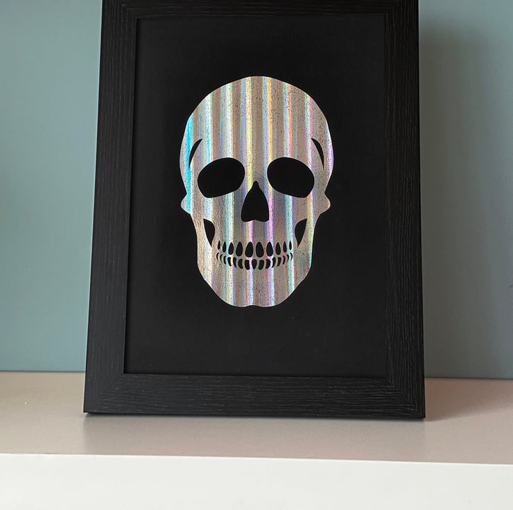 A4 skull poster. The skull is foiled in silver holographic reflective foil onto black uncoated card.