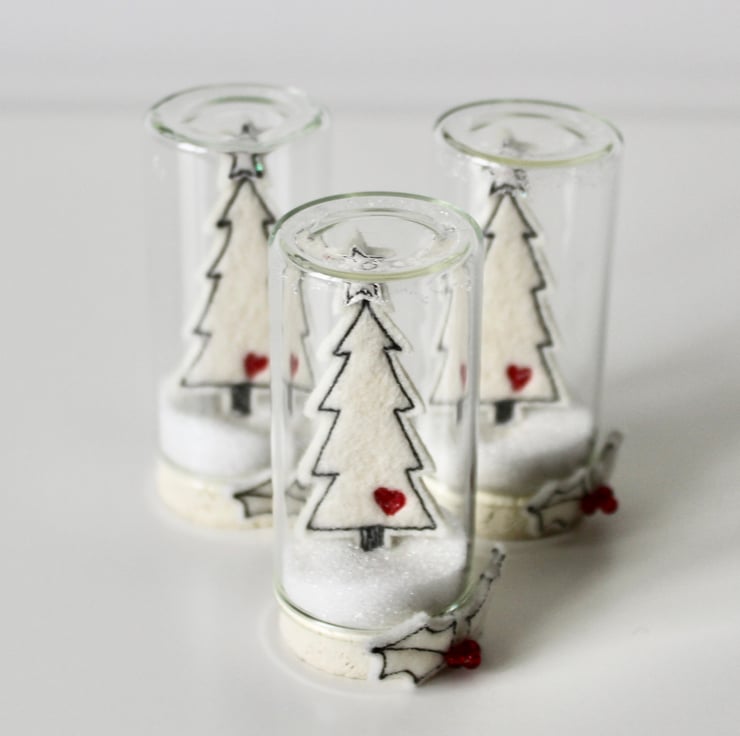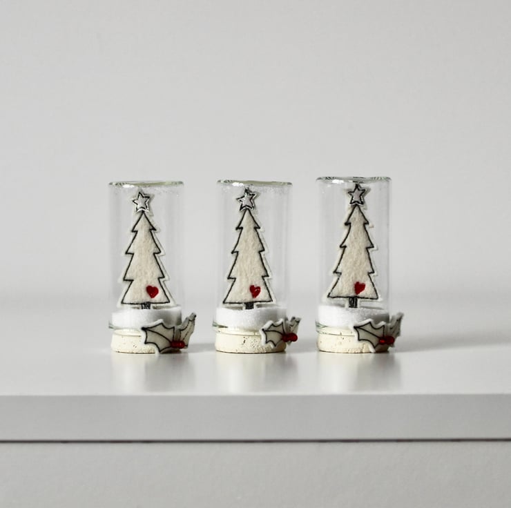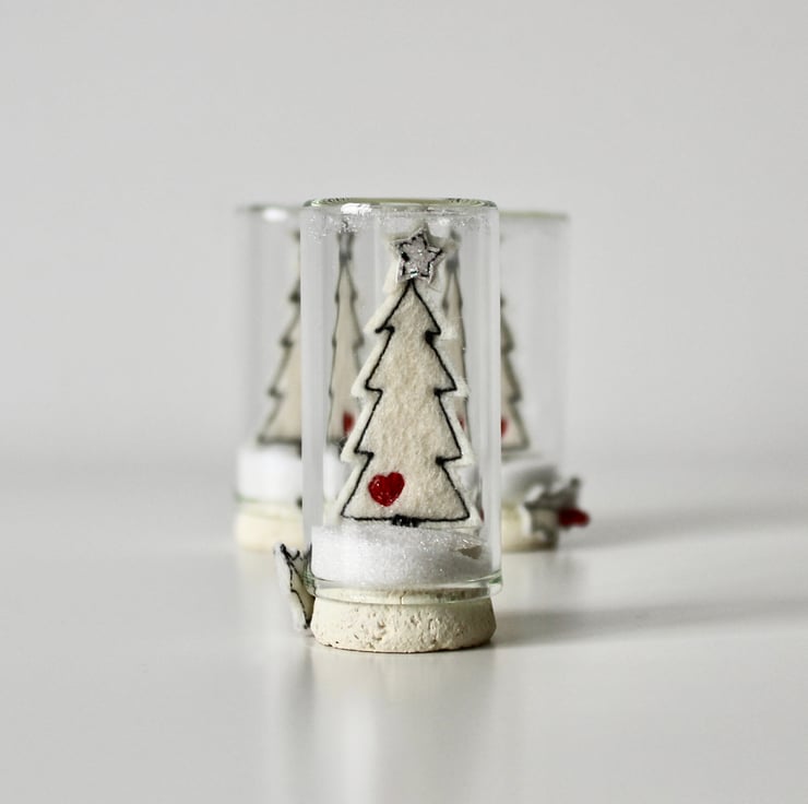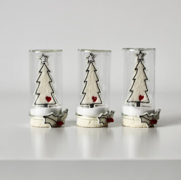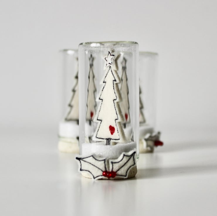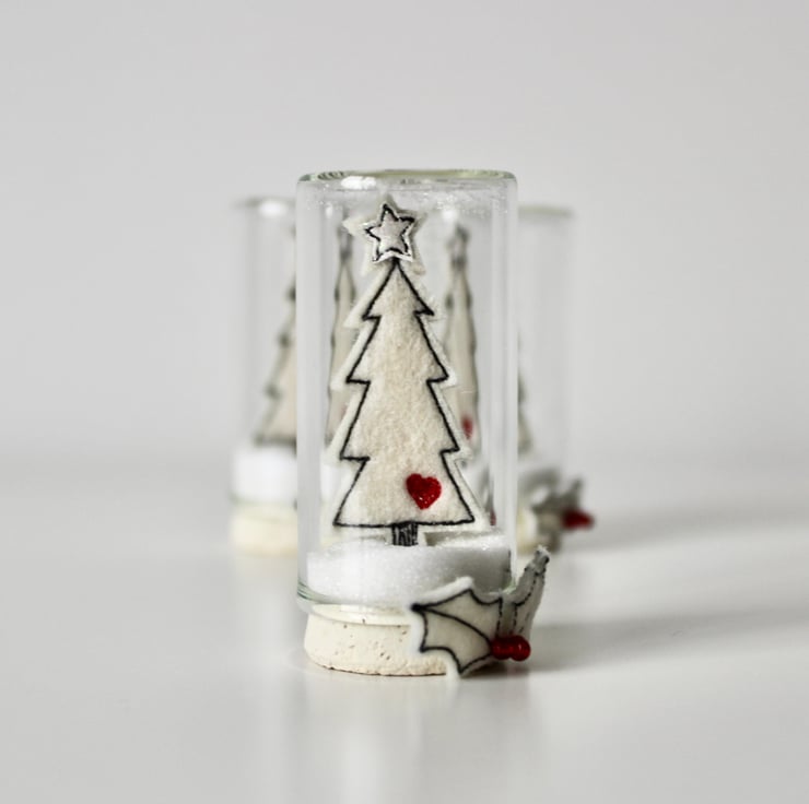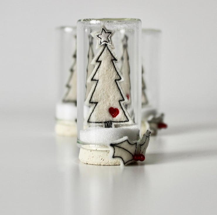 'Christmas Tree in a Glass Vial' is created using 100% cream wool felt and free hand machine embroidery. There is sewn holly with three red glass seed beads and a cream hand painted cork.