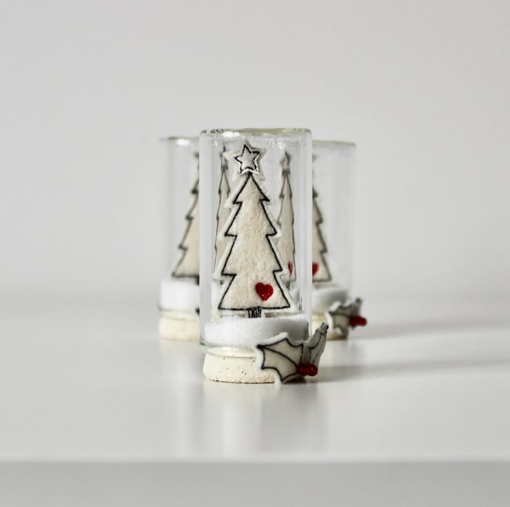 A little Christmas tree is surrounded by snow (not real snow, sorry, it's glass glitter!) with a star and holly.