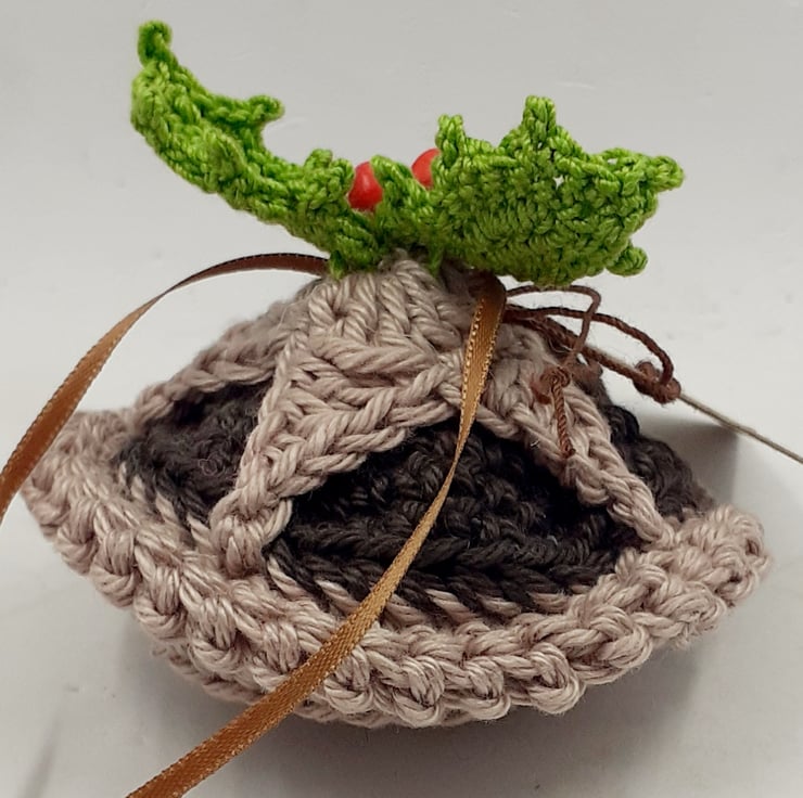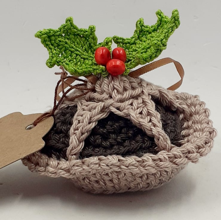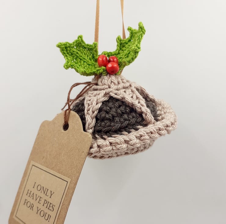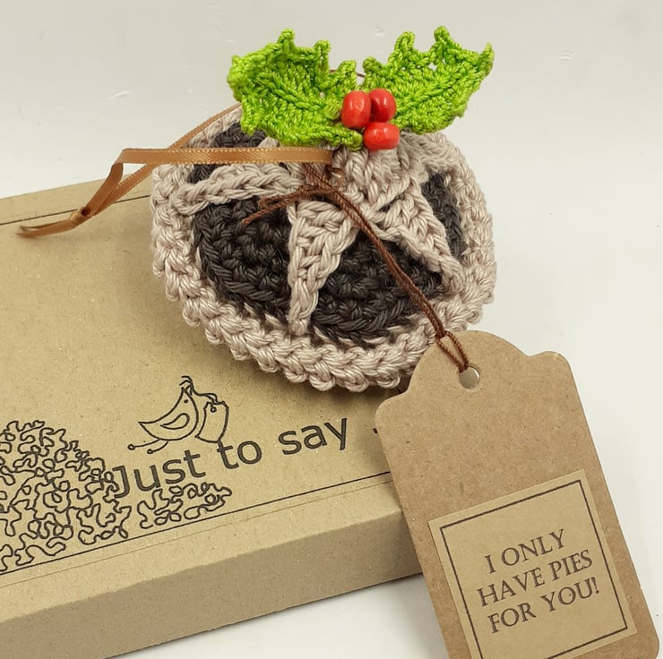 This tasty looking mince pie decoration crocheted in cotton and filled with polyester stuffing. The holly is from a pattern by Lucy at attic24 and the berries are painted wooden beads and there is a narrow ribbon hanging loop. The tag reads 'I only have pies for you! although I am very happy to exchange this tag for one with wording of your choice.