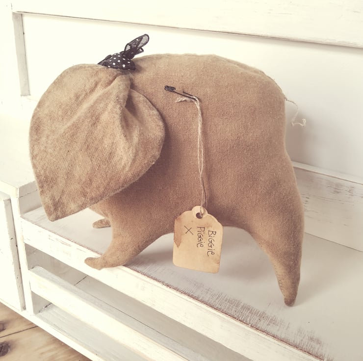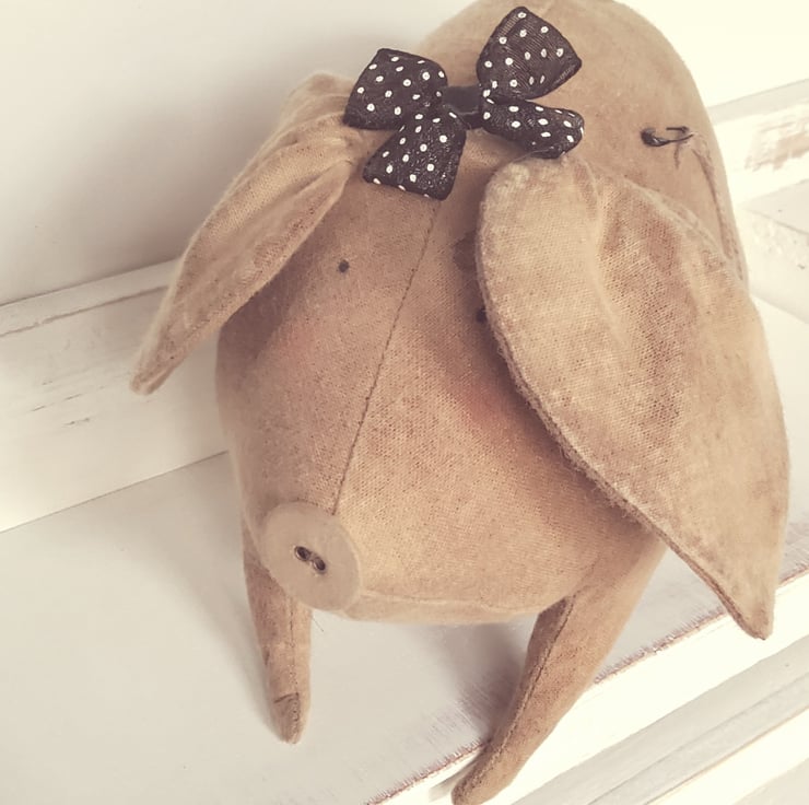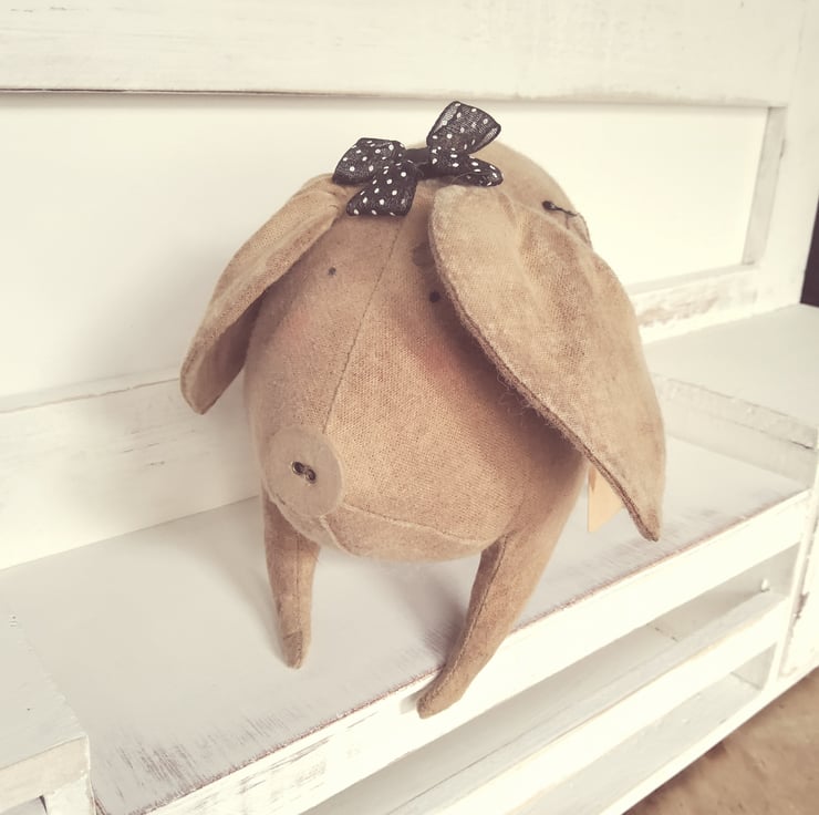Biggie Piggie is made from coffee and cinnamon dyed calico - which I have then given a good old sanding - Piggie loved it as piggies like a good scratch ! So - she has painted eyes, flushed cheeks and her snout is a big vintage linen button. She has alittle hang tag with her name and sports a pretty ribbon on her head. Biggie is freestanding and her legs contain wire to keep her rigid. She has also been stuffed with carded wool.