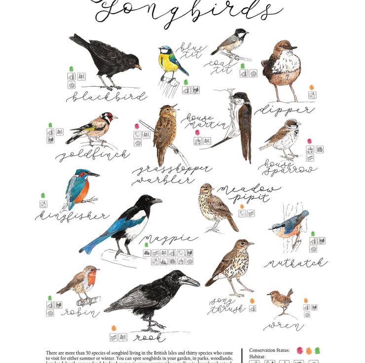 Celebrate the charm of sixteen of Britain’s native songbirds with hand-drawn illustrations in ink and watercolour, including: blackbird, blue tit, coal tit, dipper, goldfinch, grasshopper warbler, house martin, house sparrow, kingfisher, magpie, meadow pipit, nuthatch, robin, rook, song thrush, and wren.